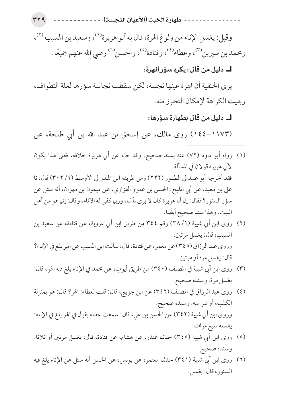 (¬٦) روى ابن أبي شيبة (٣٤١) حدثنا معتمر، عن يونس، عن الحسن أنه سئل عن الإناء يلغ فيه السنور، قال: يغسل.
