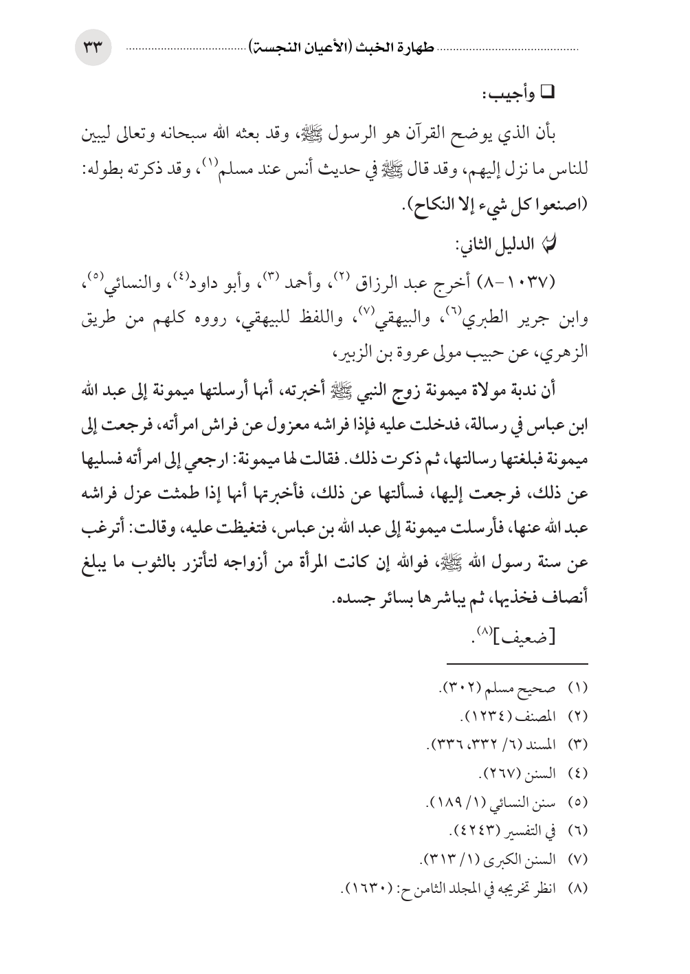 بأن الذي يوضح القرآن هو الرسول صلى الله عليه وسلم، وقد بعثه الله سبحانه وتعالى ليبين للناس ما نزل إليهم، وقد قال صلى الله عليه وسلم في حديث أنس عند مسلم (¬١)، وقد ذكرته بطوله: (اصنعوا كل شيء إلا النكاح).