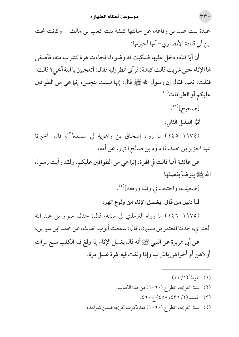 أن أبا قتادة دخل عليها فسكبت له وضوءا، فجاءت هرة لتشرب منه، فأصغى لها الإناء حتى شربت قالت كبشة: فرآني أنظر إليه فقال: أتعجبين يا ابنة أخي؟ قالت: فقلت: نعم، فقال إن رسول الله صلى الله عليه وسلم قال: إنها ليست بنجس؛ إنما هي من الطوافين عليكم أو الطوافات (¬١).