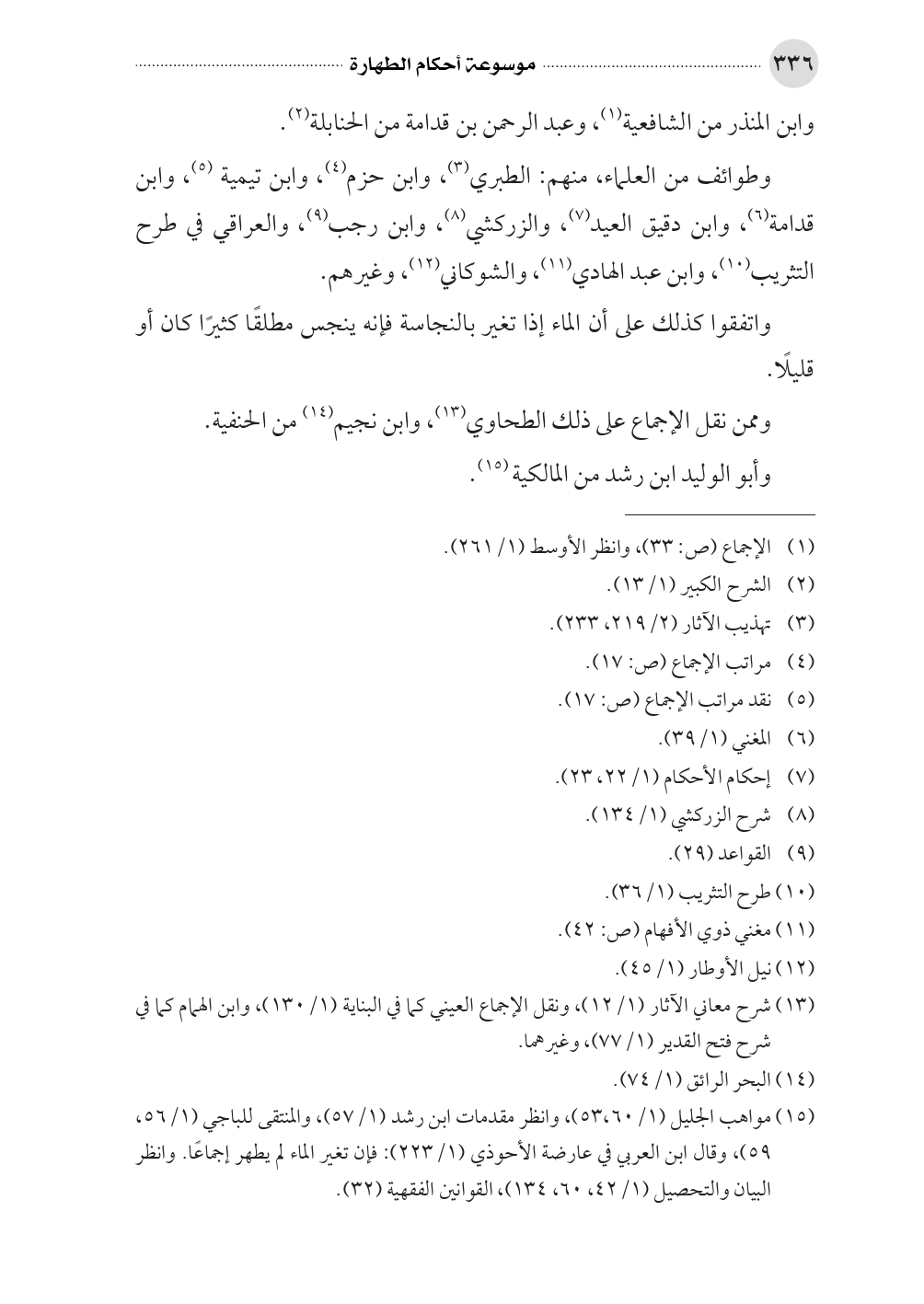 (¬١٥) مواهب الجليل (١/ ٥٣، ٦٠)، وانظر مقدمات ابن رشد (١/ ٥٧)، والمنتقى للباجي (١/ ٥٦، ٥٩)، وقال ابن العربي في عارضة الأحوذي (١/ ٢٢٣): فإن تغير الماء لم يطهر إجماعًا. وانظر البيان والتحصيل (١/ ٤٢، ٦٠، ١٣٤)، القوانين الفقهية (٣٢).