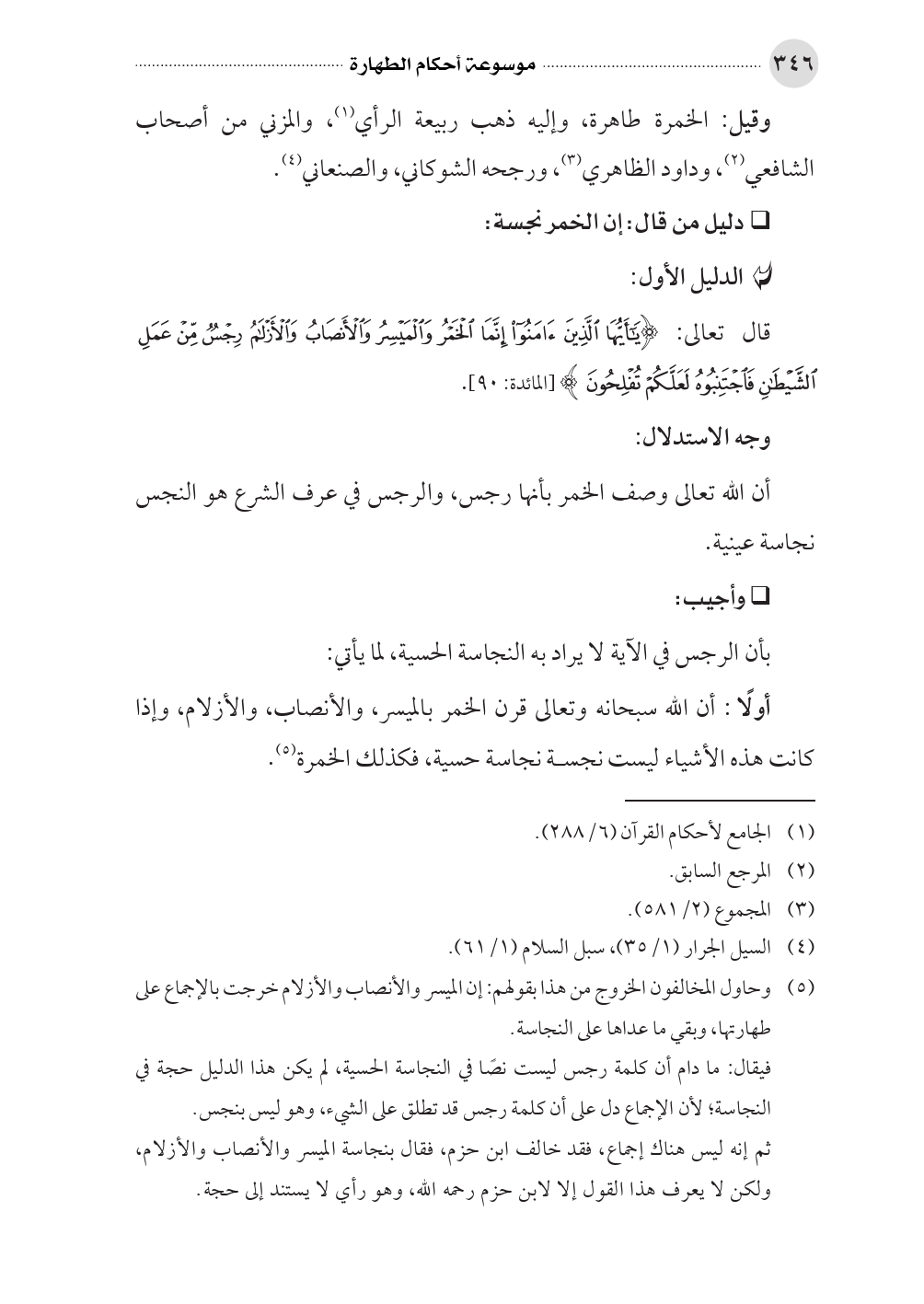 (¬٥) وحاول المخالفون الخروج من هذا بقولهم: إن الميسر والأنصاب والأزلام خرجت بالإجماع على طهارتها، وبقي ما عداها على النجاسة.