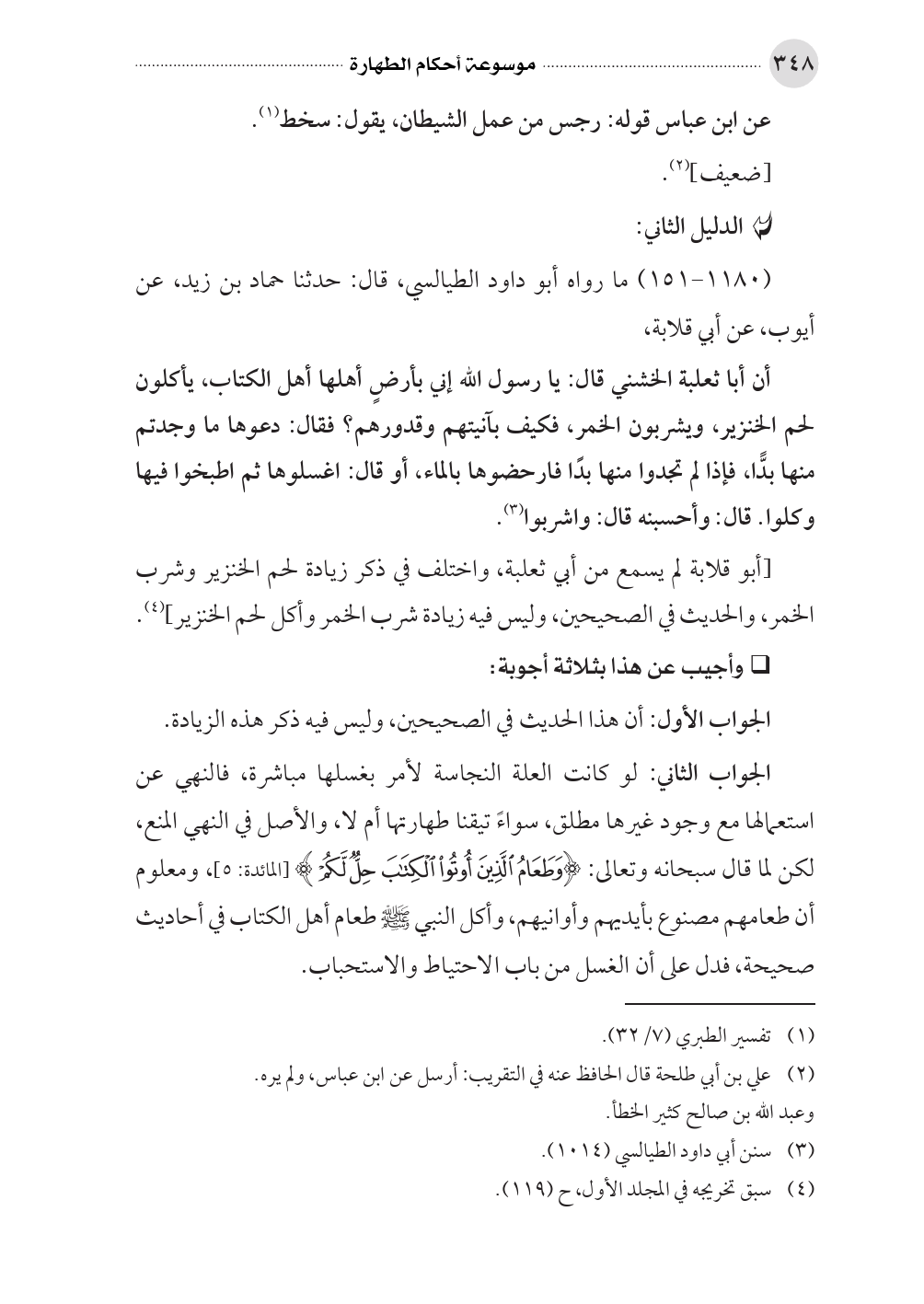 أن أبا ثعلبة الخشني قال: يا رسول الله إني بأرضٍ أهلها أهل الكتاب، يأكلون لحم الخنزير، ويشربون الخمر، فكيف بآنيتهم وقدورهم؟ فقال: دعوها ما وجدتم منها بدًّا، فإذا لم تجدوا منها بدًا فارحضوها بالماء، أو قال: اغسلوها ثم اطبخوا فيها وكلوا. قال: وأحسبنه قال: واشربوا (¬٣).