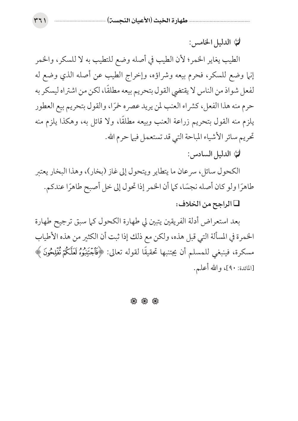 بعد استعراض أدلة الفريقين يتبين لي طهارة الكحول كما سبق ترجيح طهارة الخمرة في المسألة التي قبل هذه، ولكن مع ذلك إذا ثبت أن الكثير من هذه الأطياب مسكرة، فينبغي للمسلم أن يجتنبها تحقيقًا لقوله تعالى: (فَاجْتَنِبُوهُ لَعَلَّكُمْ تُفْلِحُونَ) [المائدة: ٩٠]، والله أعلم.