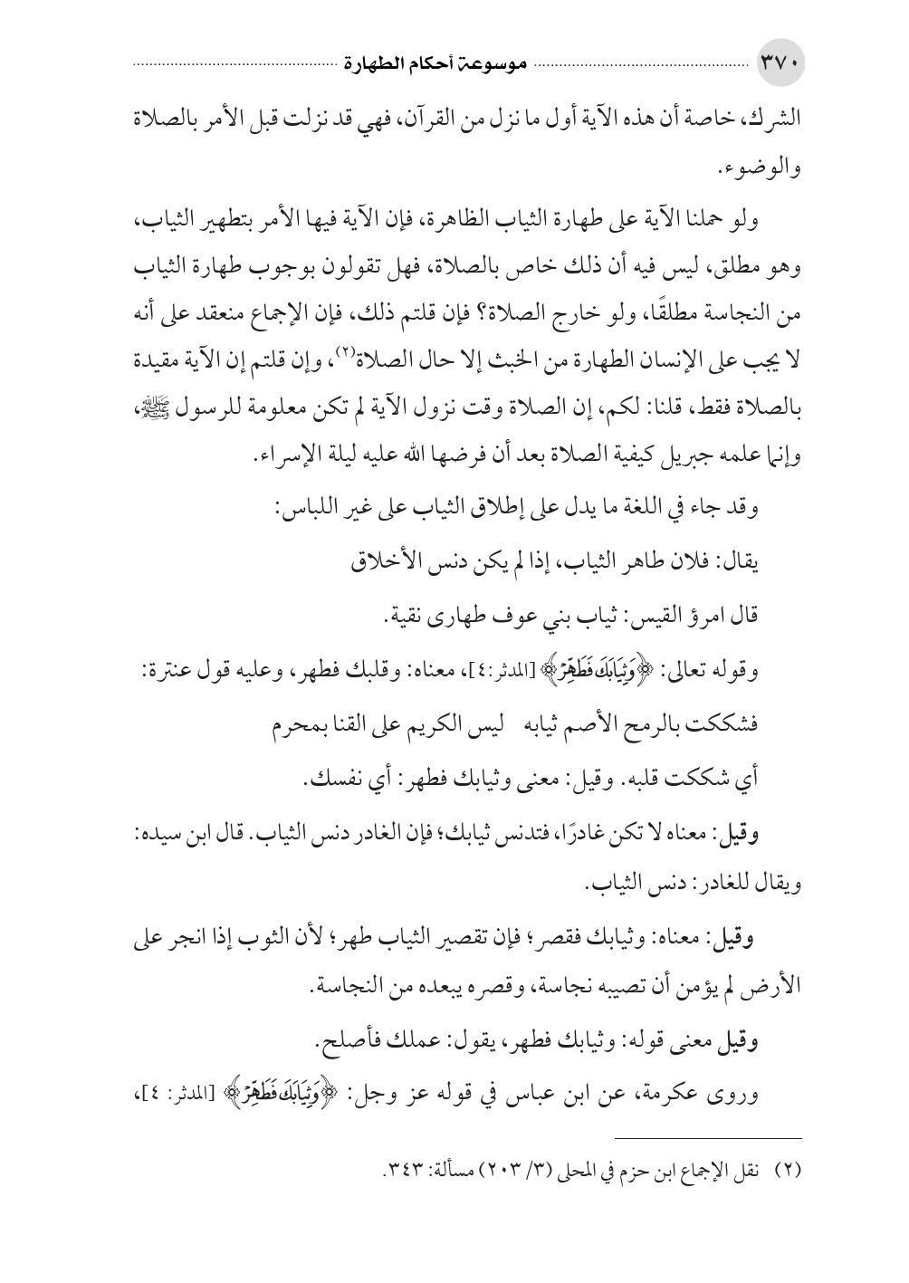 ولو حملنا الآية على طهارة الثياب الظاهرة، فإن الآية فيها الأمر بتطهير الثياب، وهو مطلق، ليس فيه أن ذلك خاص بالصلاة، فهل تقولون بوجوب طهارة الثياب من النجاسة مطلقًا، ولو خارج الصلاة؟ فإن قلتم ذلك، فإن الإجماع منعقد على أنه لا يجب على الإنسان الطهارة من الخبث إلا حال الصلاة (¬١)، وإن قلتم إن الآية مقيدة بالصلاة فقط، قلنا: لكم، إن الصلاة وقت نزول الآية لم تكن معلومة للرسول صلى الله عليه وسلم، وإنما علمه جبريل كيفية الصلاة بعد أن فرضها الله عليه ليلة الإسراء.