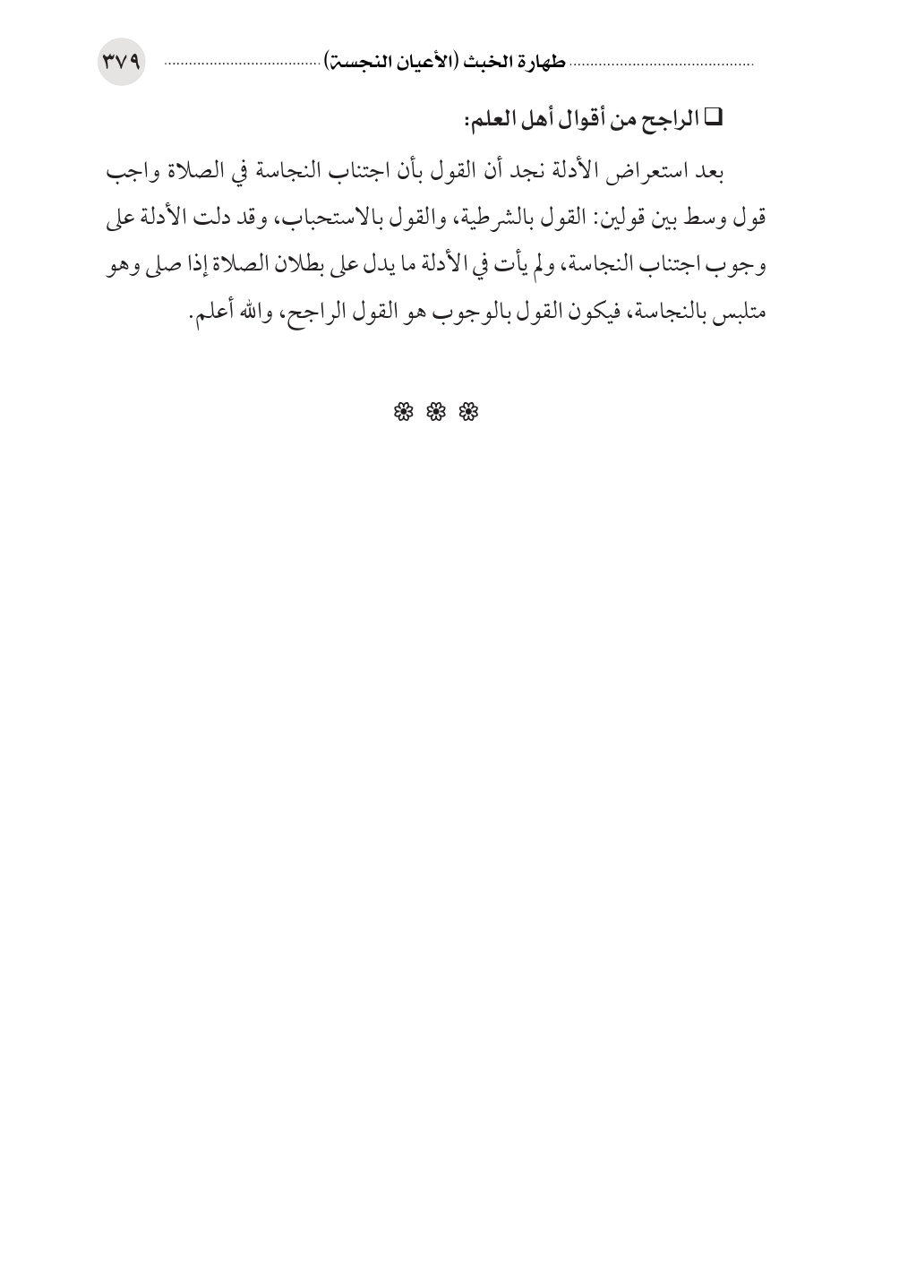 بعد استعراض الأدلة نجد أن القول بأن اجتناب النجاسة في الصلاة واجب قول وسط بين قولين: القول بالشرطية، والقول بالاستحباب، وقد دلت الأدلة على وجوب اجتناب النجاسة، ولم يأت في الأدلة ما يدل على بطلان الصلاة إذا صلى وهو متلبس بالنجاسة، فيكون القول بالوجوب هو القول الراجح، والله أعلم.