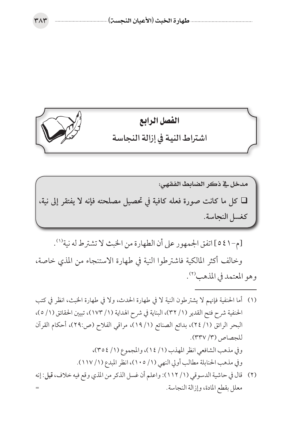 (¬١) أما الحنفية فإنهم لا يشترطون النية لا في طهارة الحدث، ولا في طهارة الخبث، انظر في كتب الحنفية شرح فتح القدير (١/ ٣٢)، البناية في شرح الهداية (١/ ١٧٣)، تبيين الحقائق (١/ ٥)، البحر الرائق (١/ ٢٤)، بدائع الصنائع (١/ ١٩)، مراقي الفلاح (ص: ٢٩)، أحكام القرآن للجصاص (٣/ ٣٣٧).