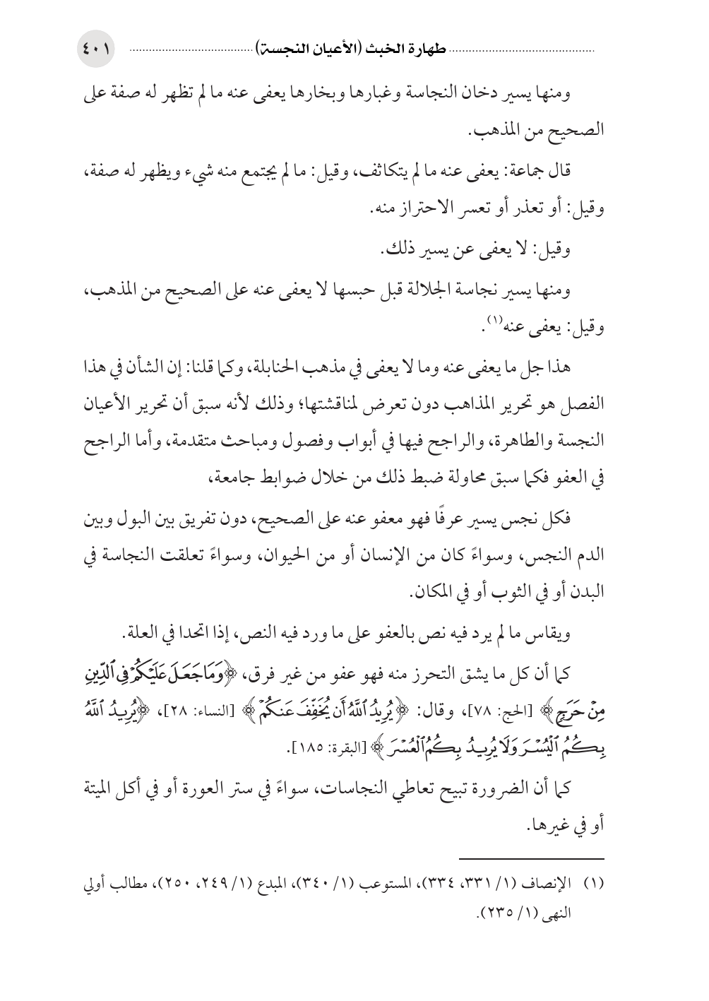 هذا جل ما يعفى عنه وما لا يعفى في مذهب الحنابلة، وكما قلنا: إن الشأن في هذا الفصل هو تحرير المذاهب دون تعرض لمناقشتها؛ وذلك لأنه سبق أن تحرير الأعيان النجسة والطاهرة، والراجح فيها في أبواب وفصول ومباحث متقدمة، وأما الراجح في العفو فكما سبق محاولة ضبط ذلك من خلال ضوابط جامعة،