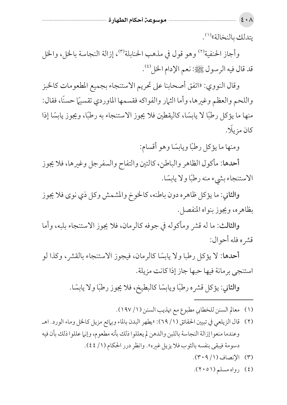 وقال النووي: «اتفق أصحابنا على تحريم الاستنجاء بجميع المطعومات كالخبز واللحم والعظم وغيرها، وأما الثمار والفواكه فقسمها الماوردي تقسيمًا حسنًا، فقال: منها ما يؤكل رطبًا لا يابسًا، كاليقطين فلا يجوز الاستنجاء به رطبًا، ويجوز يابسًا إذا كان مزيلًا.