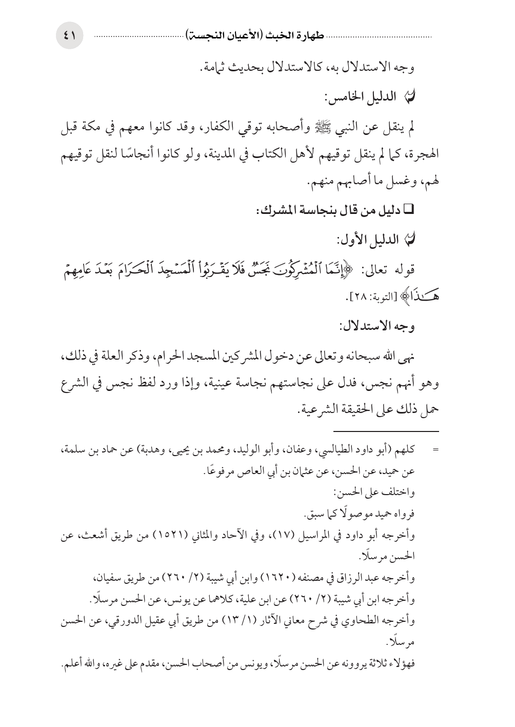 نهى الله سبحانه وتعالى عن دخول المشركين المسجد الحرام، وذكر العلة في ذلك، وهو أنهم نجس، فدل على نجاستهم نجاسة عينية، وإذا ورد لفظ نجس في الشرع حمل ذلك على الحقيقة الشرعية.