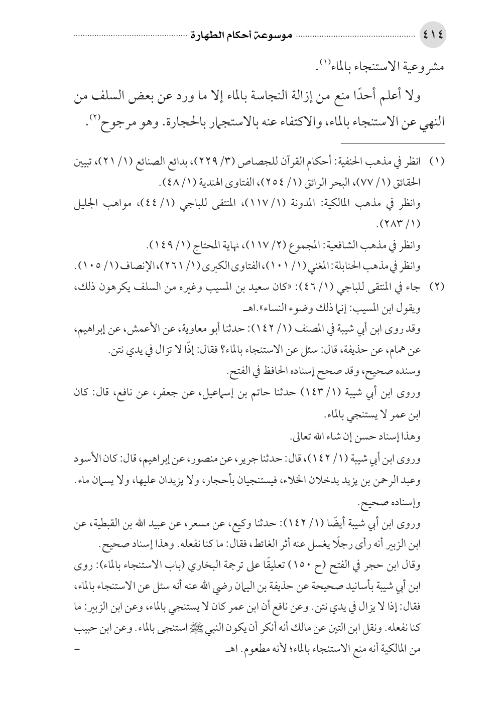 وقال ابن حجر في الفتح (ح ١٥٠) تعليقًا على ترجمة البخاري (باب الاستنجاء بالماء): روى ابن أبي شيبة بأسانيد صحيحة عن حذيفة بن اليمان رضي الله عنه أنه سئل عن الاستنجاء بالماء، فقال: إذا لا يزال في يدي نتن. وعن نافع أن ابن عمر كان لا يستنجي بالماء، وعن ابن الزبير: ما كنا نفعله. ونقل ابن التين عن مالك أنه أنكر أن يكون النبي صلى الله عليه وسلم استنجى بالماء. وعن ابن حبيب من المالكية أنه منع الاستنجاء بالماء؛ لأنه مطعوم. اهـ