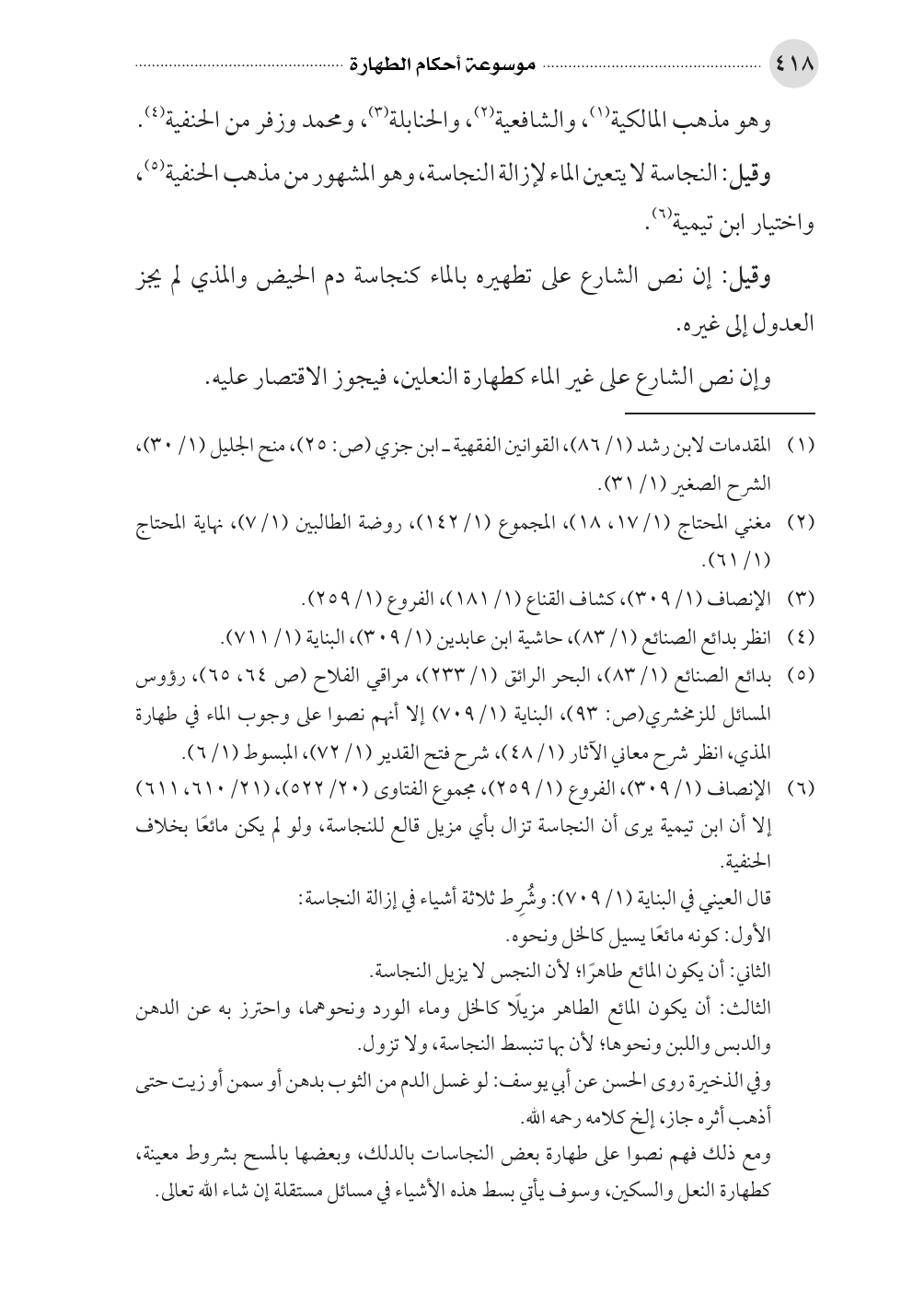 (¬٦) الإنصاف (١/ ٣٠٩)، الفروع (١/ ٢٥٩)، مجموع الفتاوى (٢٠/ ٥٢٢)، (٢١/ ٦١٠، ٦١١) إلا أن ابن تيمية يرى أن النجاسة تزال بأي مزيل قالع للنجاسة، ولو لم يكن مائعًا بخلاف الحنفية.
