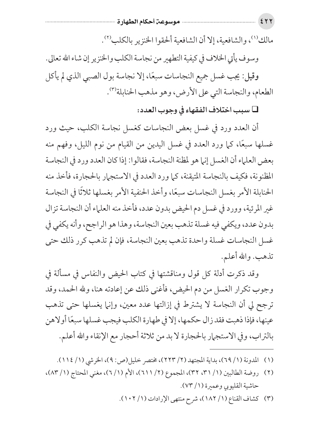 (¬١) المدونة (١/ ٦٩)، بداية المجتهد (٢/ ٢٢٣)، مختصر خليل (ص: ٩)، الخرشي (١/ ١١٤).