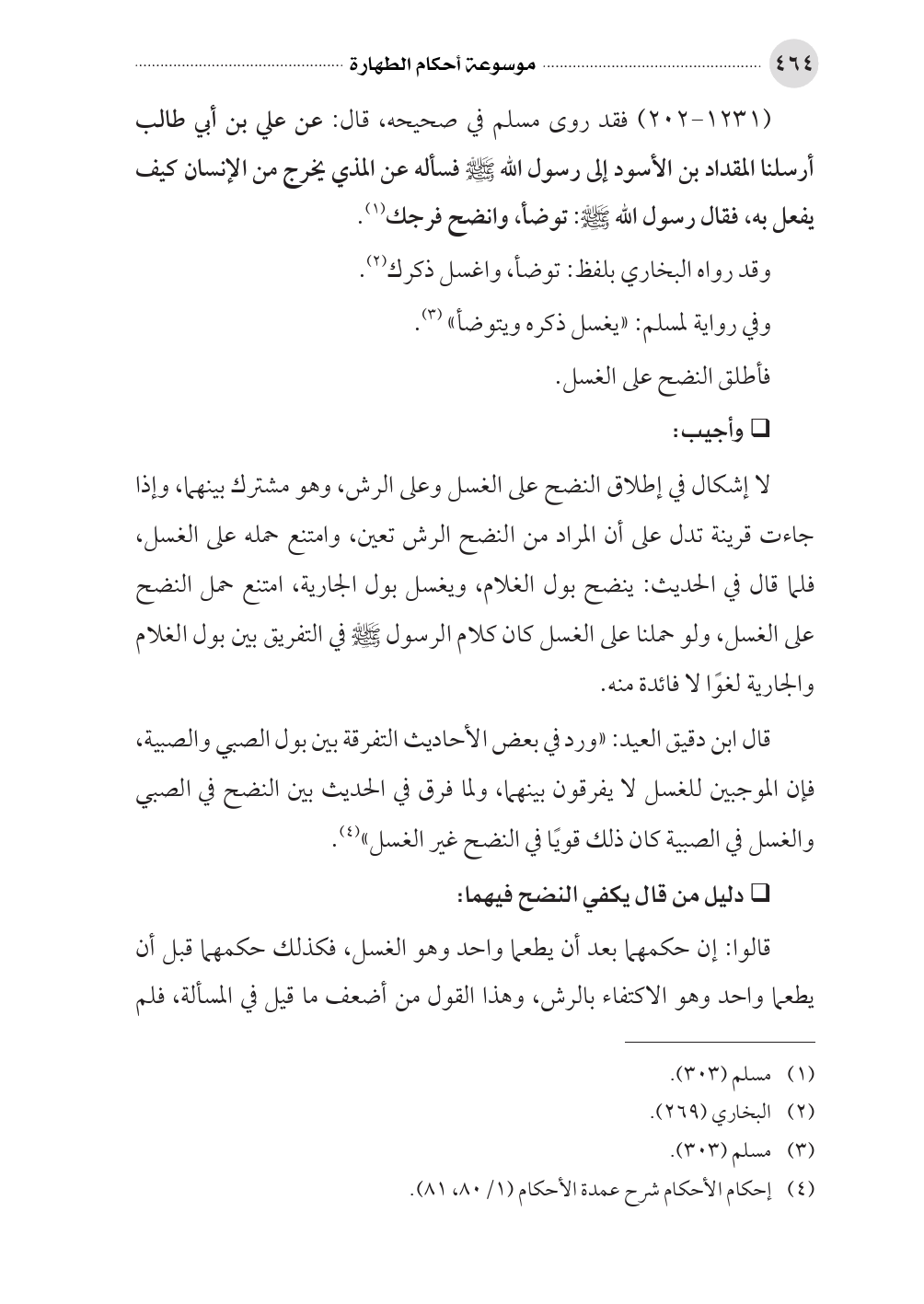 (١٢٣١ - ٢٠٢) فقد روى مسلم في صحيحه، قال: عن علي بن أبي طالب أرسلنا المقداد بن الأسود إلى رسول الله صلى الله عليه وسلم فسأله عن المذي يخرج من الإنسان كيف يفعل به، فقال رسول الله صلى الله عليه وسلم: توضأ، وانضح فرجك (¬١).