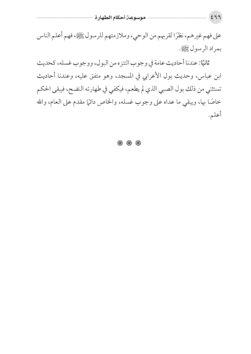 ثانيًا: عندنا أحاديث عامة في وجوب التنزه من البول، ووجوب غسله، كحديث ابن عباس، وحديث بول الأعرابي في المسجد، وهو متفق عليه، وعندنا أحاديث تستثني من ذلك بول الصبي الذي لم يطعم، فيكفي في طهارته النضح، فيبقى الحكم خاصًا بها، ويبقي ما عداه على وجوب غسله، والخاص دائمًا مقدم على العام، والله أعلم.