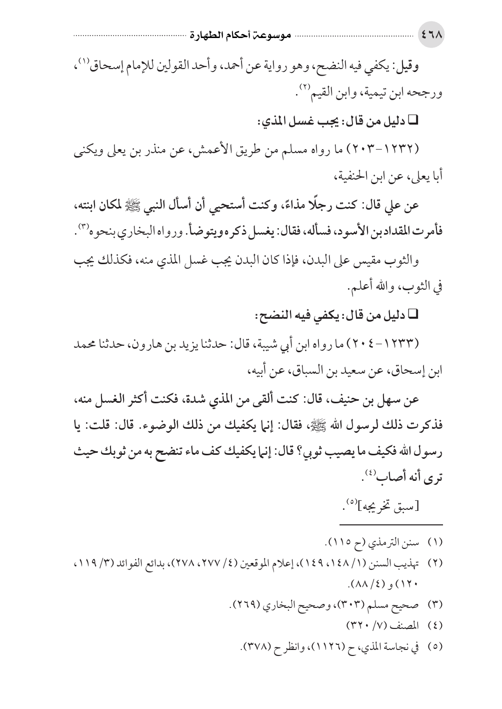 عن سهل بن حنيف، قال: كنت ألقى من المذي شدة، فكنت أكثر الغسل منه، فذكرت ذلك لرسول الله صلى الله عليه وسلم، فقال: إنما يكفيك من ذلك الوضوء. قال: قلت: يا رسول الله فكيف ما يصيب ثوبي؟ قال: إنما يكفيك كف ماء تنضح به من ثوبك حيث ترى أنه أصاب (¬٤).