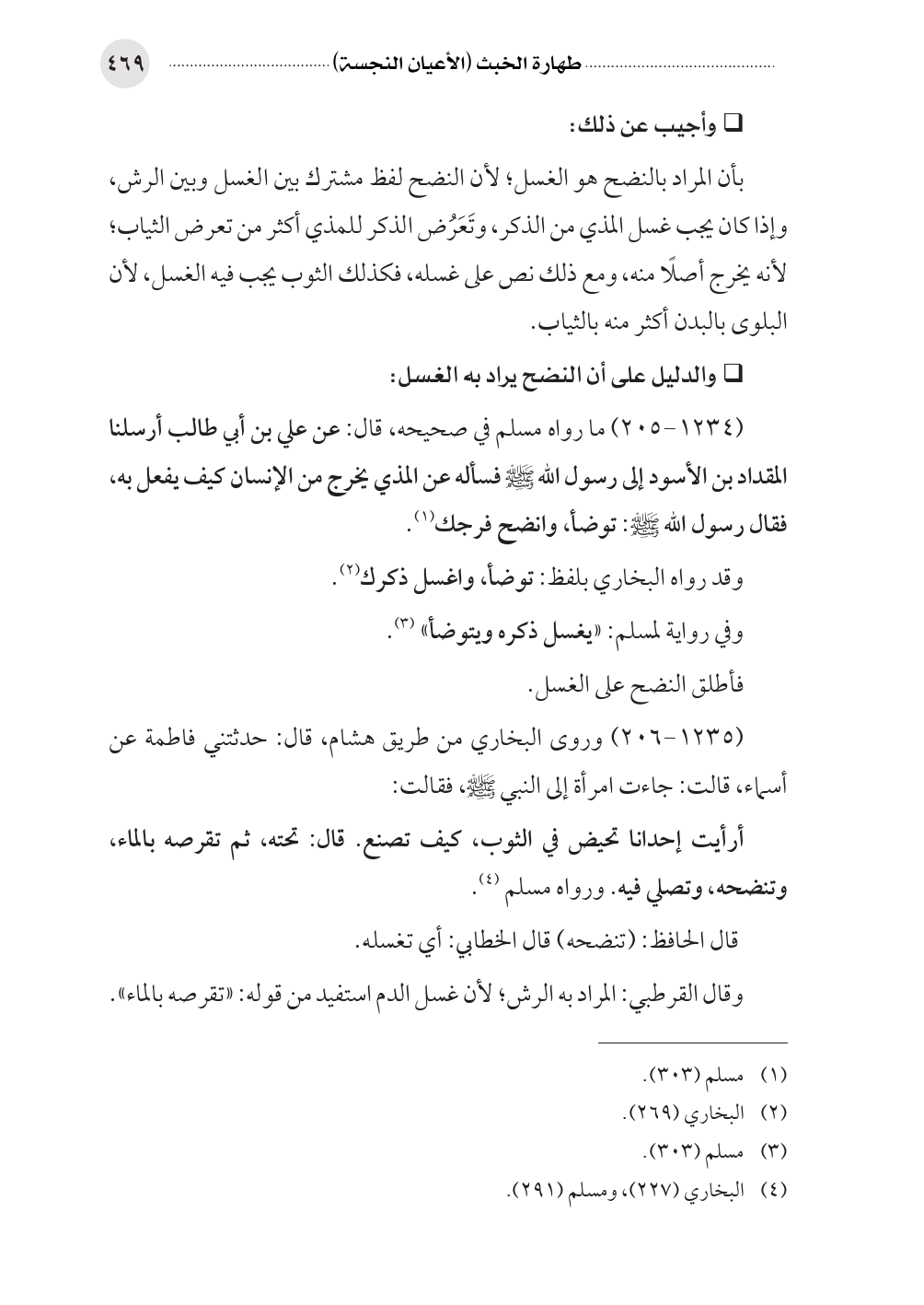 (١٢٣٤ - ٢٠٥) ما رواه مسلم في صحيحه، قال: عن علي بن أبي طالب أرسلنا المقداد بن الأسود إلى رسول الله صلى الله عليه وسلم فسأله عن المذي يخرج من الإنسان كيف يفعل به، فقال رسول الله صلى الله عليه وسلم: توضأ، وانضح فرجك (¬١).