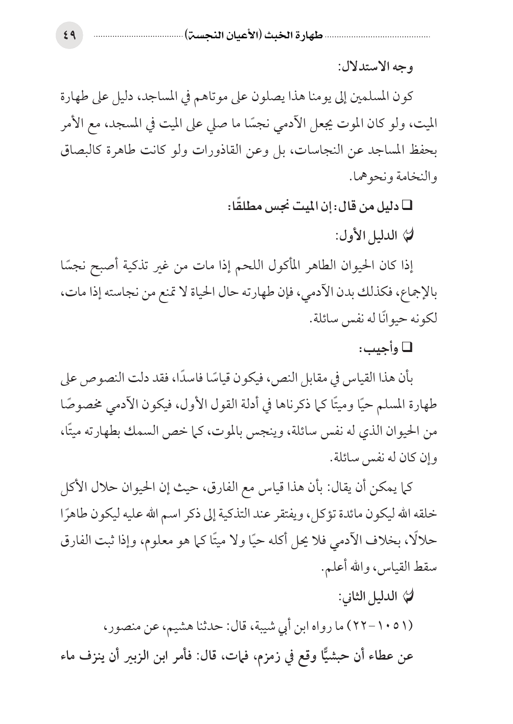 بأن هذا القياس في مقابل النص، فيكون قياسًا فاسدًا، فقد دلت النصوص على طهارة المسلم حيًا وميتًا كما ذكرناها في أدلة القول الأول، فيكون الآدمي مخصوصًا من الحيوان الذي له نفس سائلة، وينجس بالموت، كما خص السمك بطهارته ميتًا، وإن كان له نفس سائلة.