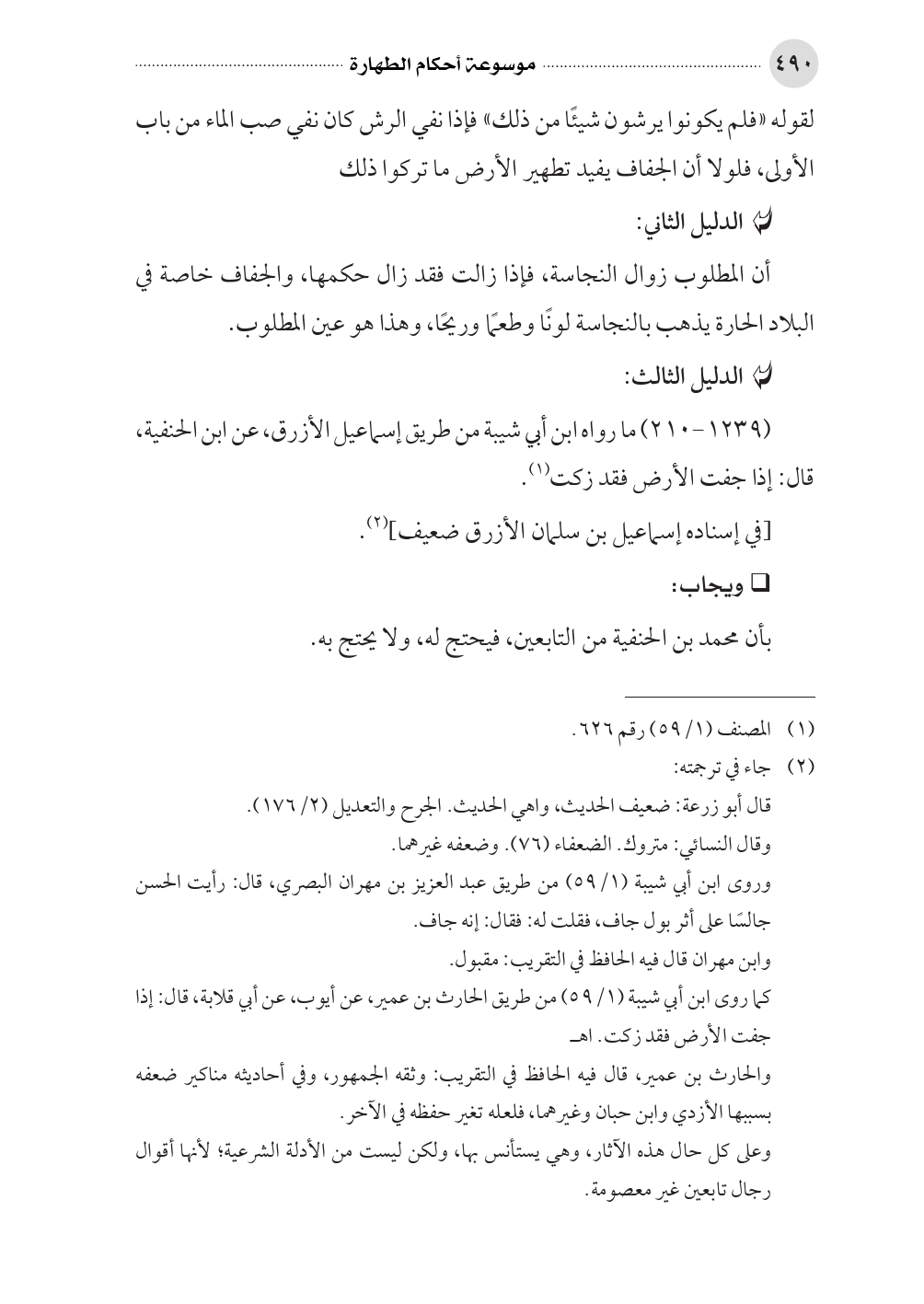 (١٢٣٩ - ٢١٠) ما رواه ابن أبي شيبة من طريق إسماعيل الأزرق، عن ابن الحنفية، قال: إذا جفت الأرض فقد زكت (¬١).