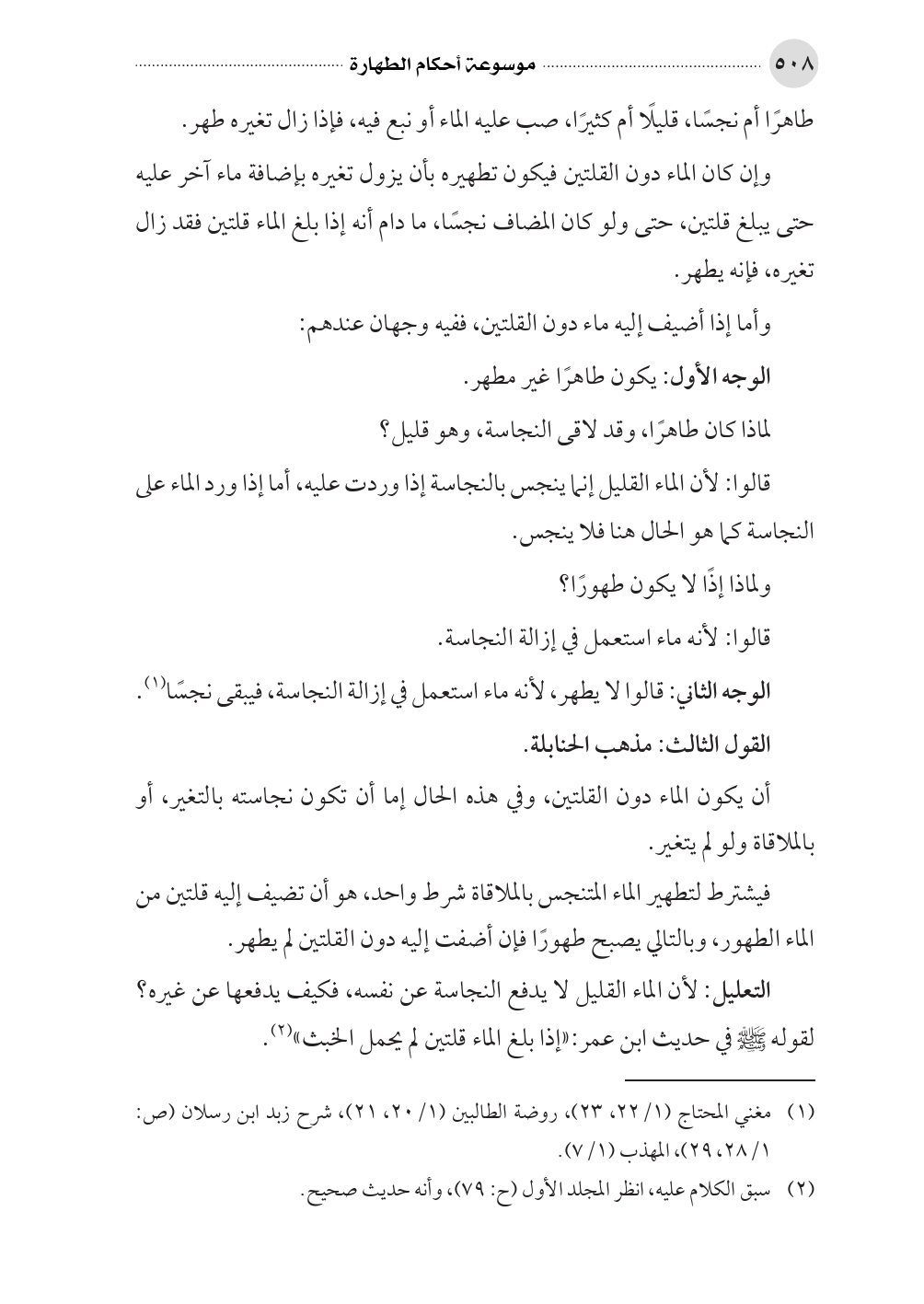 التعليل: لأن الماء القليل لا يدفع النجاسة عن نفسه، فكيف يدفعها عن غيره؟ لقوله صلى الله عليه وسلم في حديث ابن عمر: «إذا بلغ الماء قلتين لم يحمل الخبث» (¬٢).