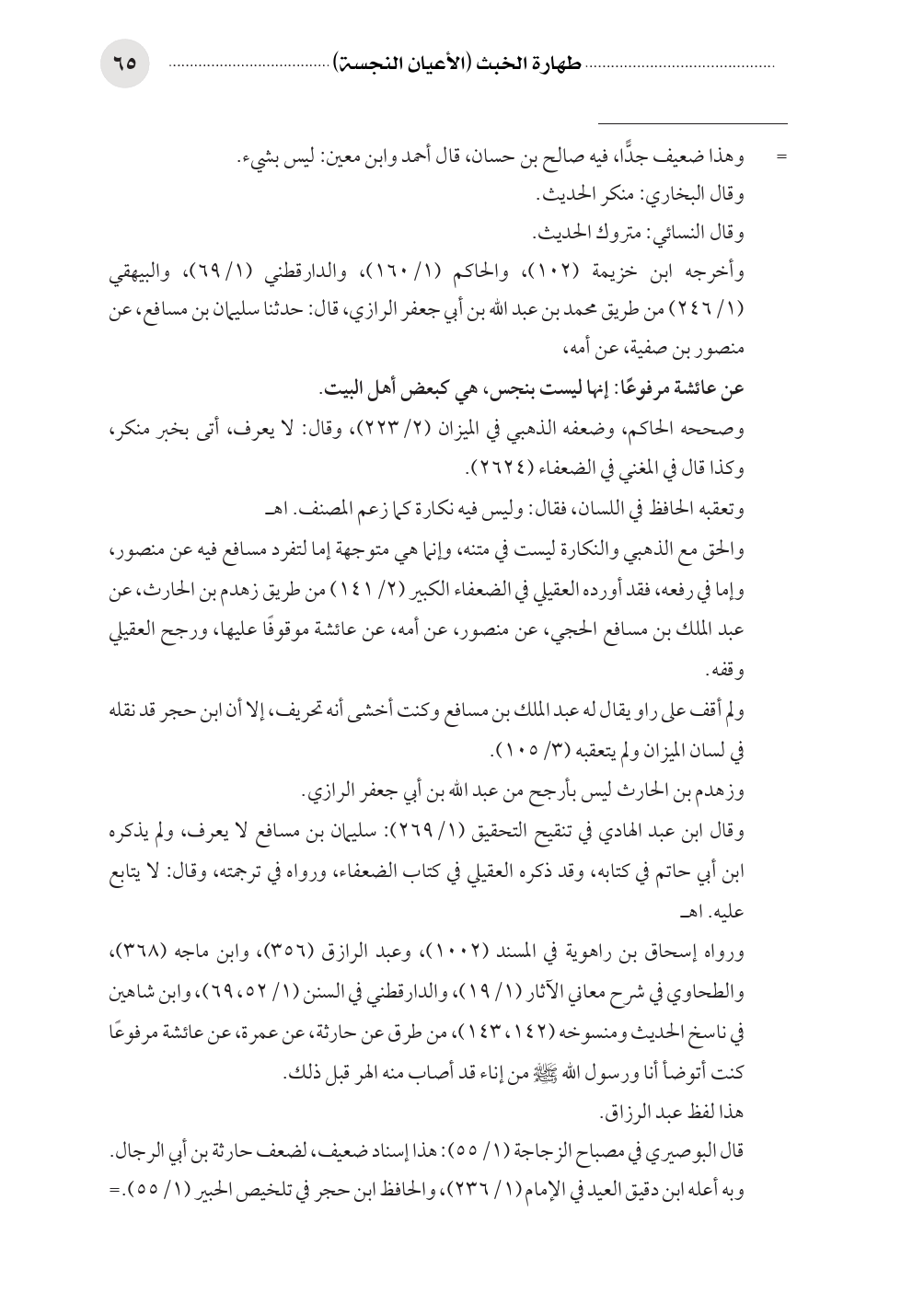 عن عائشة مرفوعًا: إنها ليست بنجس، هي كبعض أهل البيت.
