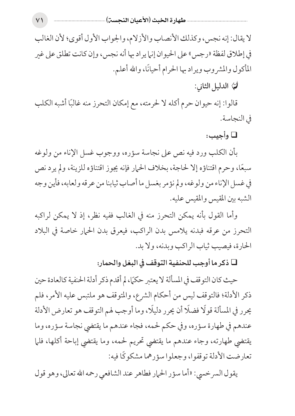 لا يقال: إنه نجس، وكذلك الأنصاب والأزلام، والجواب الأول أقوى؛ لأن الغالب في إطلاق لفظة «رجس» على الحيوان إنما يراد بها أنه نجس، وإن كانت تطلق على غير المأكول والمشروب ويراد بها الحرام أحيانًا، والله أعلم.