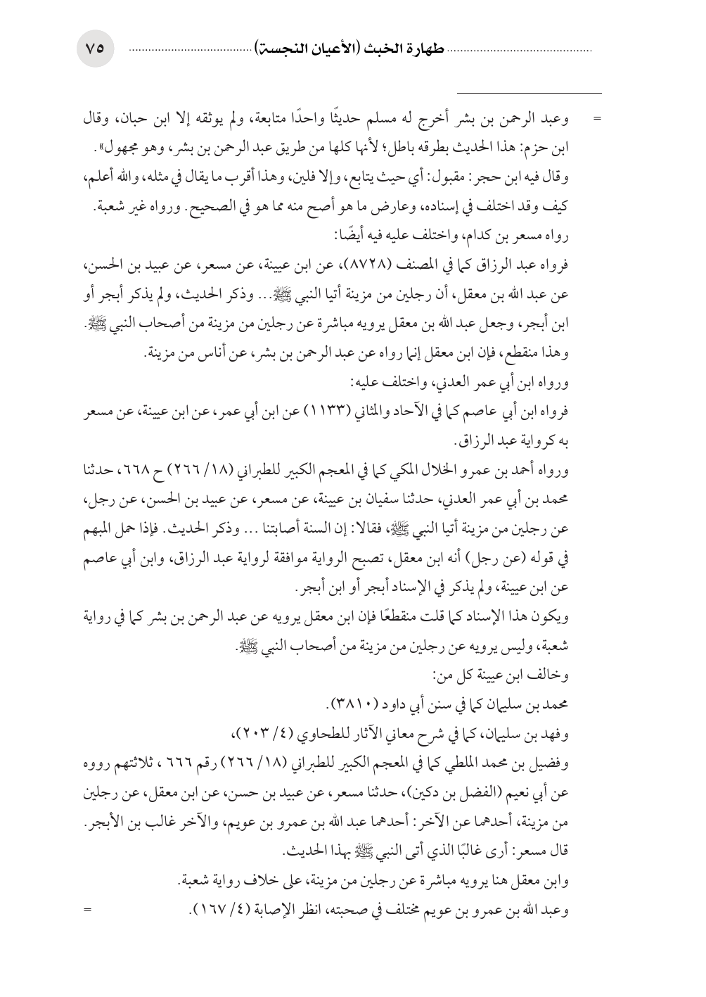 ويكون هذا الإسناد كما قلت منقطعًا فإن ابن معقل يرويه عن عبد الرحمن بن بشر كما في رواية شعبة، وليس يرويه عن رجلين من مزينة من أصحاب النبي صلى الله عليه وسلم.