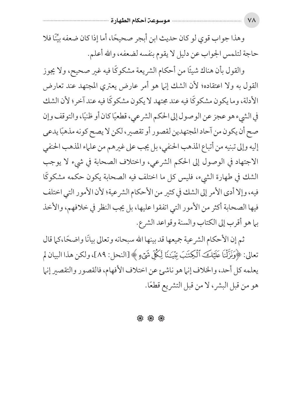 والقول بأن هناك شيئًا من أحكام الشريعة مشكوكًا فيه غير صحيح، ولا يجوز القول به ولا اعتقاده؛ لأن الشك إنما هو أمر عارض يعتري المجتهد عند تعارض الأدلة، وما يكون مشكوكًا فيه عند مجتهد لا يكون مشكوكًا فيه عند آخر؛ لأن الشك في الشيء هو عجز عن الوصول إلى الحكم الشرعي، قطعيًا كان أو ظنيًا، والتوقف وإن صح أن يكون من آحاد المجتهدين لقصور أو تقصير، لكن لا يصح كونه مذهبًا يدعى إليه وإلى تبنيه من أتباع المذهب الحنفي، بل يجب على غيرهم من علماء المذهب الحنفي الاجتهاد في الوصول إلى الحكم الشرعي، واختلاف الصحابة في شيء لا يوجب الشك في طهارة الشيء، فليس كل ما اختلف فيه الصحابة يكون حكمه مشكوكًا فيه، وإلا أدى الأمر إلى الشك في كثير من الأحكام الشرعية؛ لأن الأمور التي اختلف فيها الصحابة أكثر من الأمور التي اتفقوا عليها، بل يجب النظر في خلافهم، والأخذ بما هو أقرب إلى الكتاب والسنة وقواعد الشرع.
