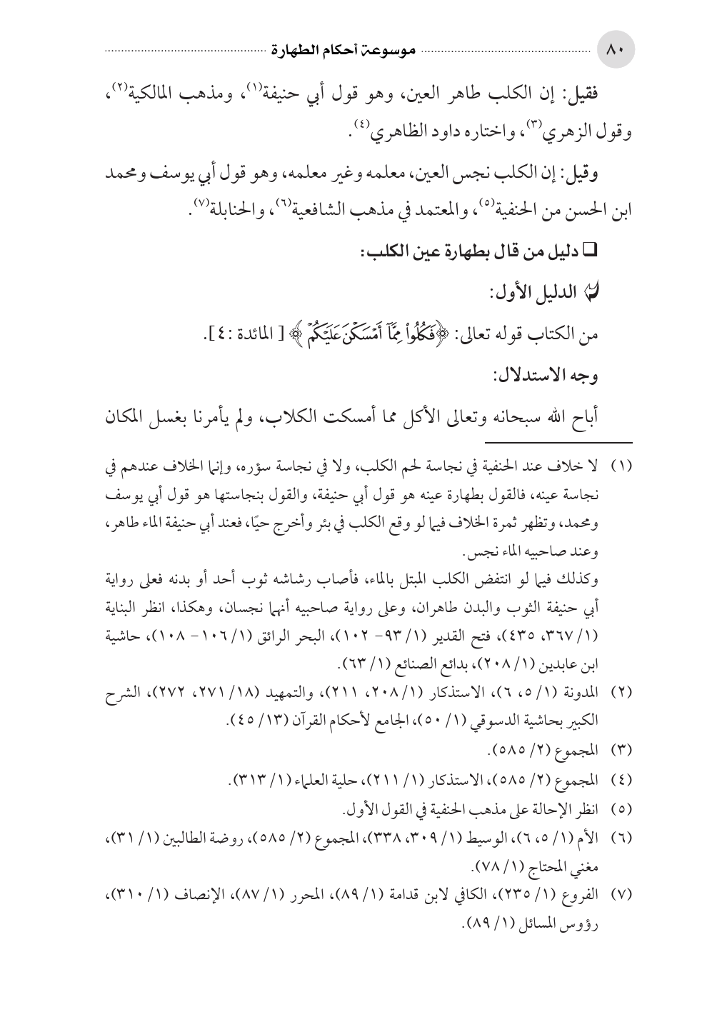 (¬١) لا خلاف عند الحنفية في نجاسة لحم الكلب، ولا في نجاسة سؤره، وإنما الخلاف عندهم في نجاسة عينه، فالقول بطهارة عينه هو قول أبي حنيفة، والقول بنجاستها هو قول أبي يوسف ومحمد، وتظهر ثمرة الخلاف فيما لو وقع الكلب في بئر وأخرج حيًا، فعند أبي حنيفة الماء طاهر، وعند صاحبيه الماء نجس.