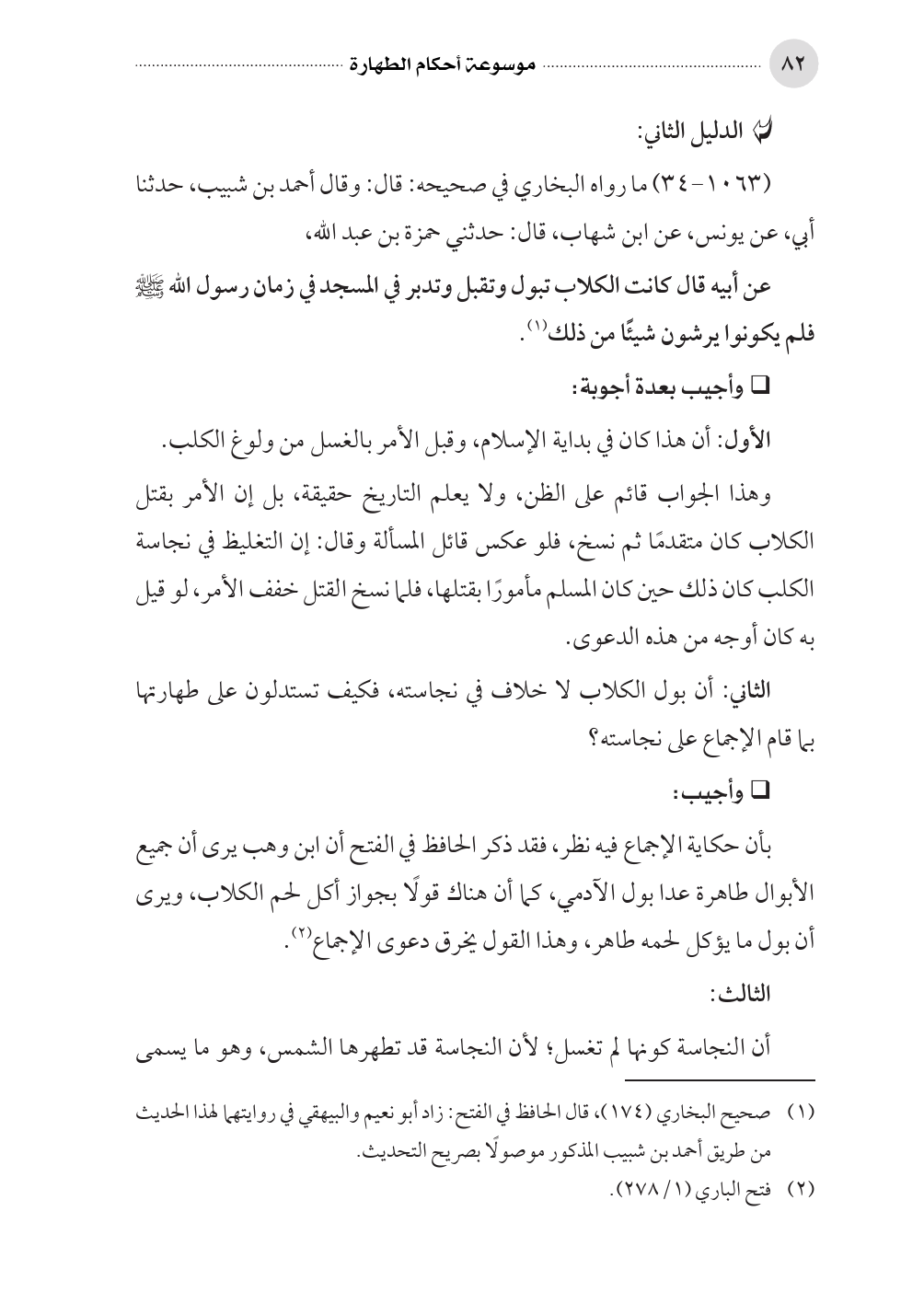 الثاني: أن بول الكلاب لا خلاف في نجاسته، فكيف تستدلون على طهارتها بما قام الإجماع على نجاسته؟