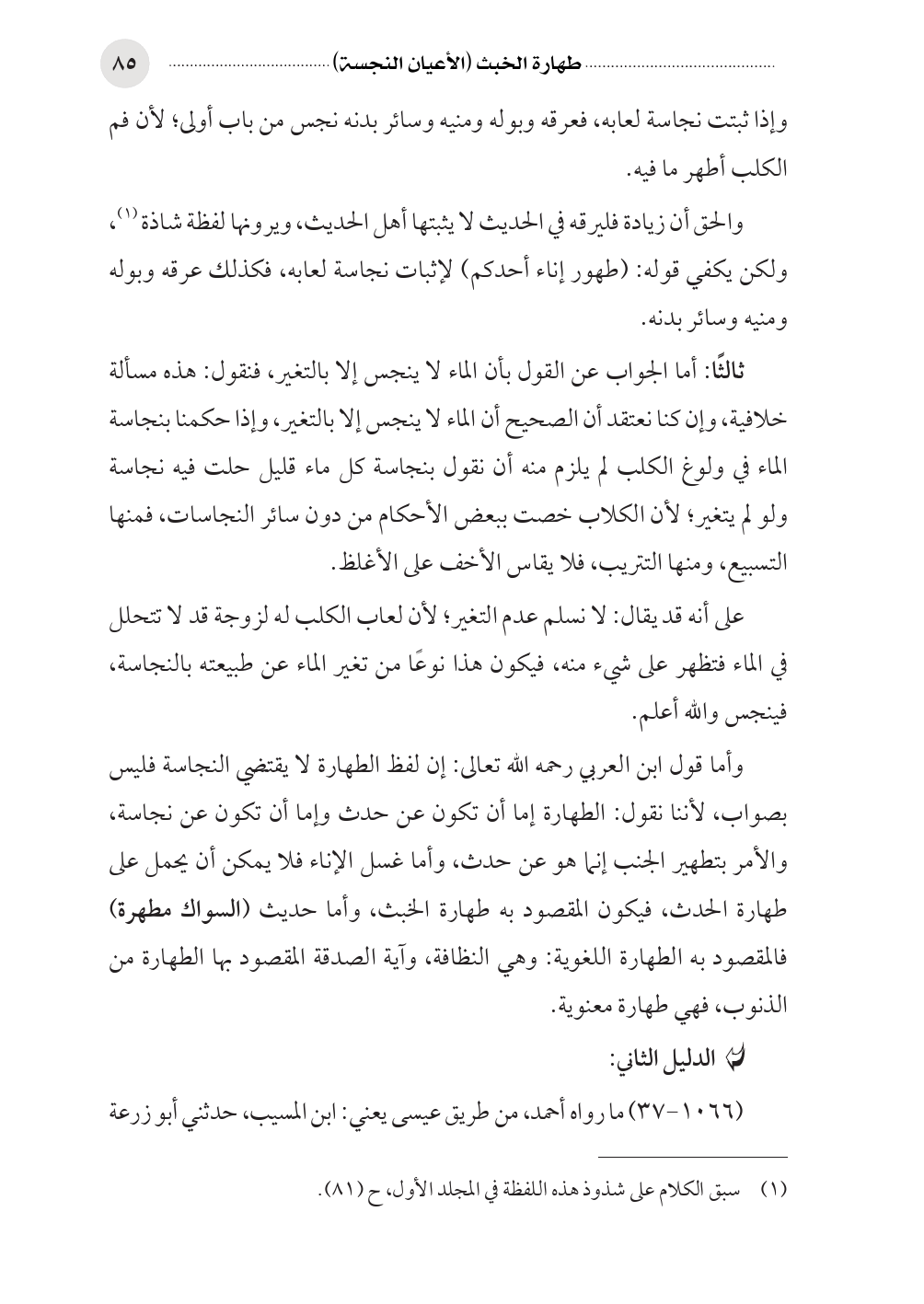وأما قول ابن العربي رحمه الله تعالى: إن لفظ الطهارة لا يقتضي النجاسة فليس بصواب، لأننا نقول: الطهارة إما أن تكون عن حدث وإما أن تكون عن نجاسة، والأمر بتطهير الجنب إنما هو عن حدث، وأما غسل الإناء فلا يمكن أن يحمل على طهارة الحدث، فيكون المقصود به طهارة الخبث، وأما حديث (السواك مطهرة) فالمقصود به الطهارة اللغوية: وهي النظافة، وآية الصدقة المقصود بها الطهارة من الذنوب، فهي طهارة معنوية.