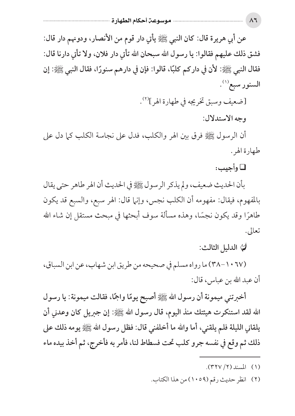 بأن الحديث ضعيف، ولم يذكر الرسول صلى الله عليه وسلم في الحديث أن الهر طاهر حتى يقال بالمفهوم، فيقال: مفهومه أن الكلب نجس، وإنما قال: الهر سبع، والسبع قد يكون طاهرًا وقد يكون نجسًا، وهذه مسألة سوف أبحثها في مبحث مستقل إن شاء الله تعالى.