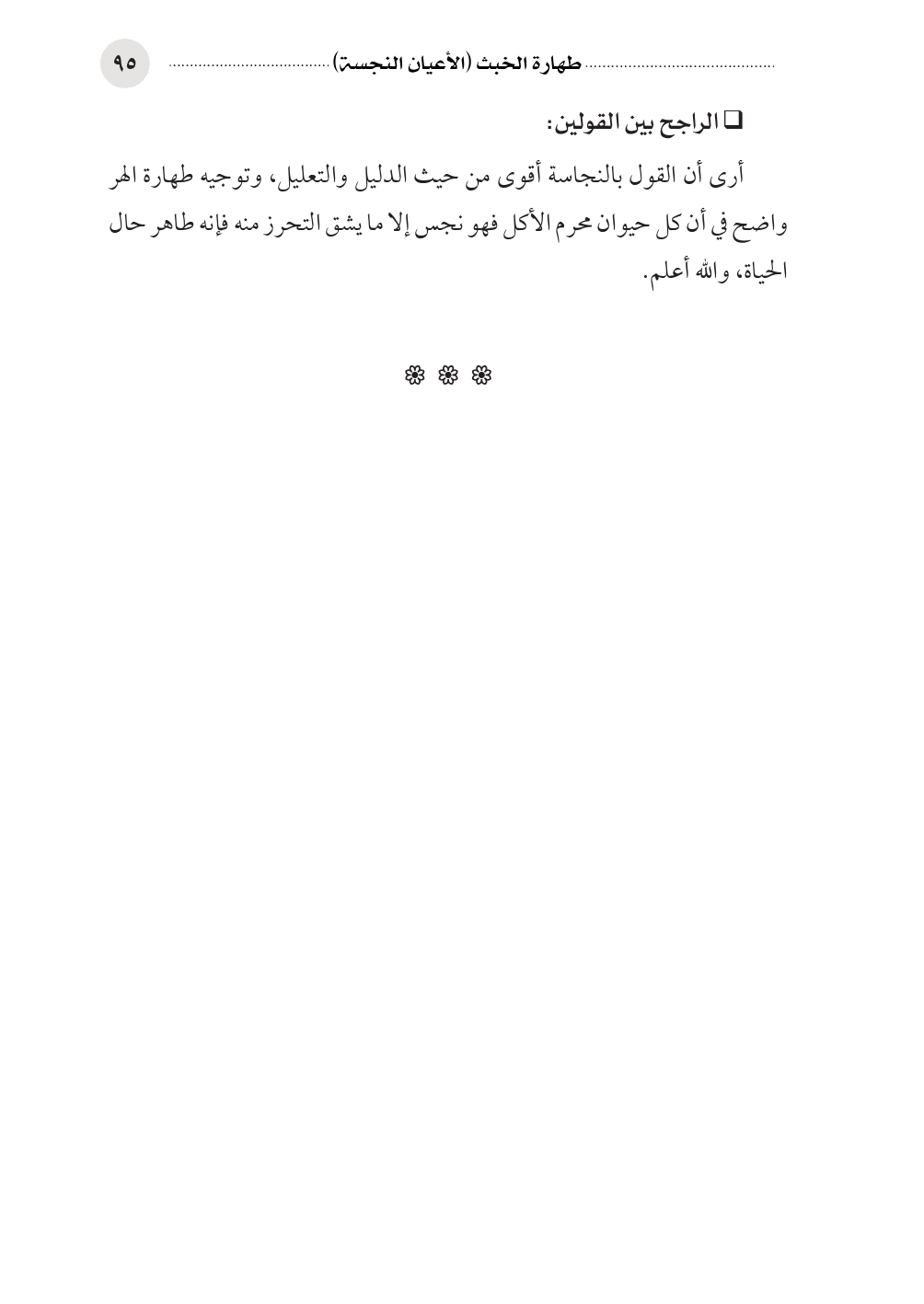 أرى أن القول بالنجاسة أقوى من حيث الدليل والتعليل، وتوجيه طهارة الهر واضح في أن كل حيوان محرم الأكل فهو نجس إلا ما يشق التحرز منه فإنه طاهر حال الحياة، والله أعلم.