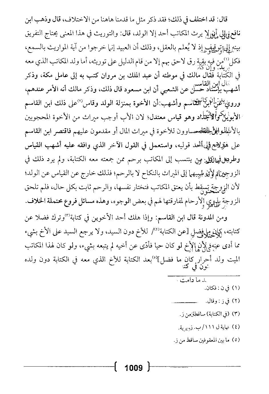 قال: قد اختلف في ذلك؛ فقد ذكر مثل ما قدمنا هاهنا من الاختلاف، قال وذهب ابن نافع إلى أن لا يرث المكاتب أحد إلا الولد، قال: التوريث في هذا المعنى يحتاج التفريق بينه إلى توقيف إذ لا يُعلم بالعقل، وذلك أن العبيد إنما خرجوا من آية المواريث بالسمع، فكل من فيه بقية رق لا حق بهم إلا من قام الدليل على توريثه، أما ولد المكاتب الذي معه في الكتابة فقال مالك في موطئه أن عبد الملك بن مروان كتب به إلى عامل مكة، وذكر أشهب بإسناد حسن عن الشعبي أن ابن مسعود قال ذلك، وذكر مالك أنه الأمر عندهم، وروي عن ابن القاسم وأشهب: أن الأخوة بمنزلة الولد وقاس على ذلك ابن القاسم الأبوين والأجداد وهو قياس معتدل؛ لأن الأب أوجب ميراث من الأخوة المحجوبين بالأب؟؟؟؟؟؟؟؟؟؟؟ مساوون للأخوة في ميراث المال أو مقدمون عليهم فاقتصر ابن القاسم على؟؟؟؟؟؟؟؟ أحد قوليه، واستعمل في القول الآخر الذي وافقه عليه أشهب القياس وطرد؟؟؟؟؟؟؟ من ينتسب إلى المكاتب برحم ممن جمعته معه الكتابة، ولم يرد ذلك في؟؟؟؟؟؟؟؟؟ سببهما إلى الميراث بالنكاح لا بالرحم؛ فذلك خارج عن القياس عن الولد؛ لأن الزوجة تسقط بأن يعتق المكاتب فتختار نفسها، والرحم ثابت بكل حال، فلم تلحق الزوجة بذوي الارحام لمفارقتها لهم في بعض الوجوه، وهذه مسائل فروع محتملة الخلاف.