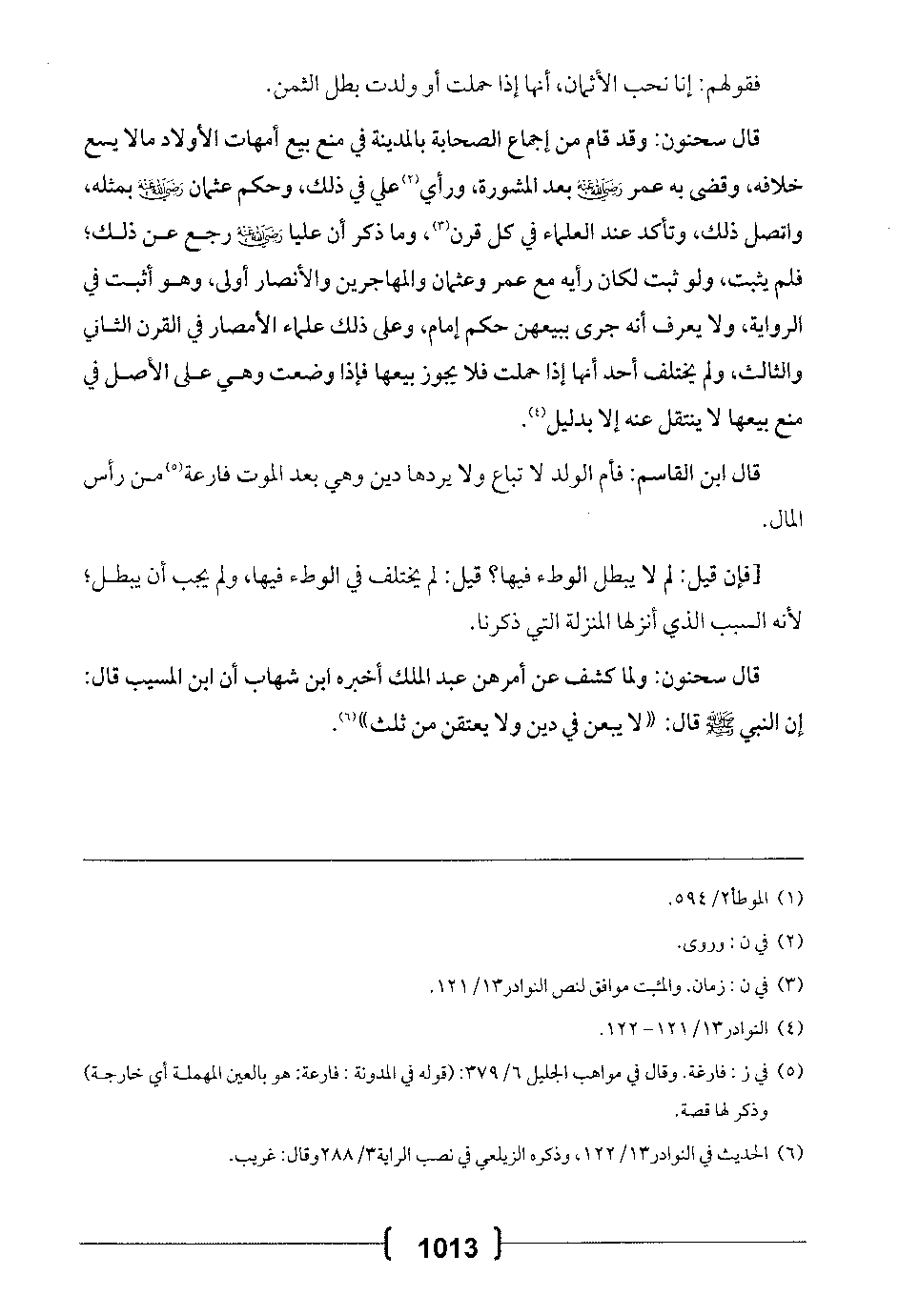 قال سحنون: ولما كشف عن أمرهن عبد الملك أخبره ابن شهاب أن ابن المسيب قال: إن النبي -صلى الله عليه وسلم- قال: «لا يبعن في دين ولا يعتقن من ثلث».