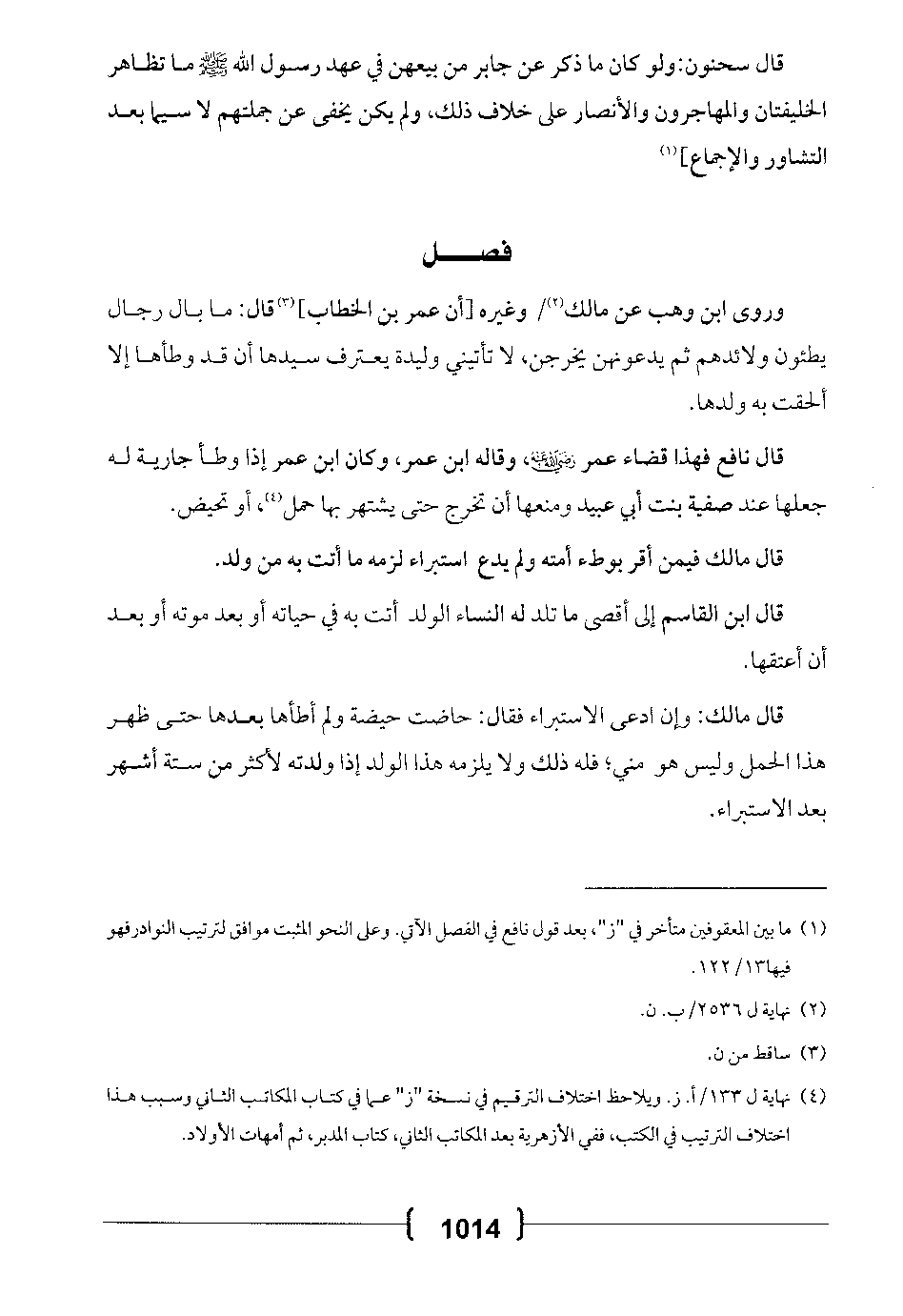 قال نافع فهذا قضاء عمر -رضي الله عنه-، وقاله ابن عمر، وكان ابن عمر إذا وطأ جارية له جعلها عند صفية بنت أبي عبيد ومنعها أن تخرج حتى يشتهر بها حمل، أو تحيض.