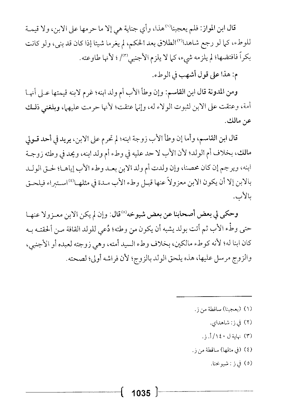 قال ابن القاسم، وأما إن وطأ الأب زوجة ابنه؛ لم تحرم على الابن، يريد في أحد قولي مالك، بخلاف أم الولد؛ لأن الأب لا حد عليه في وطء أم ولد ابنه، ويحد في وطئه زوجة ابنه، ويرجم إن كان محصناً، وإن ولدت أم ولد الابن بعد وطء الأب إياها؛ لحق الولد بالابن إلا أن يكون الابن معزولاً عنها قبل وطء الأب مدة في مثلها استبراء فيلحق بالأب.