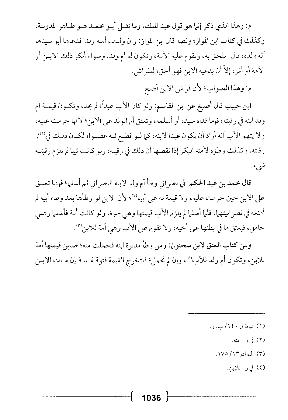 ابن حبيب قال أصبغ عن ابن القاسم: ولو كان الأب عبداً؛ لم يحد، وتكون قيمة أم ولد ابنه في رقبته، فإما فداه سيده أو أسلمه، وتعتق أم الولد على الابن؛ لأنها حرمت عليه، ولا يتهم الأب أنه أراد أن يكون عبداً لابنه، كما لو قطع له عضواً؛ لكان ذلك في رقبته، وكذلك وطؤه لأمته البكر إذا نقصها إن ذلك في رقبته، ولو كان ثيباً لم يلزم رقبته شيء.