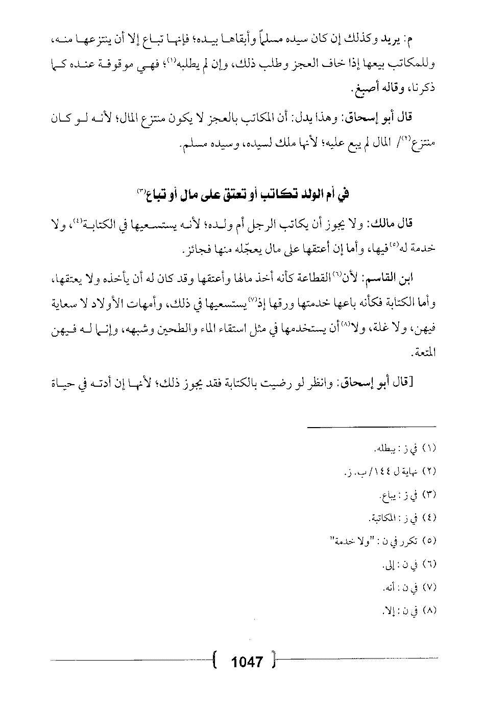 ابن القاسم: لأن القطاعة كأنه أخذ مالها وأعتقها وقد كان له أن يأخذه ولا يعتقها، وأما الكتابة فكأنه باعها خدمتها ورقها إذ يستسعيها في ذلك، وأمهات الأولاد لا سعاية فيهن، ولا غلة، ولا أن يستخدمها في مثل استقاء الماء والطحين وشبهه، وإنما له فيهن المتعة.