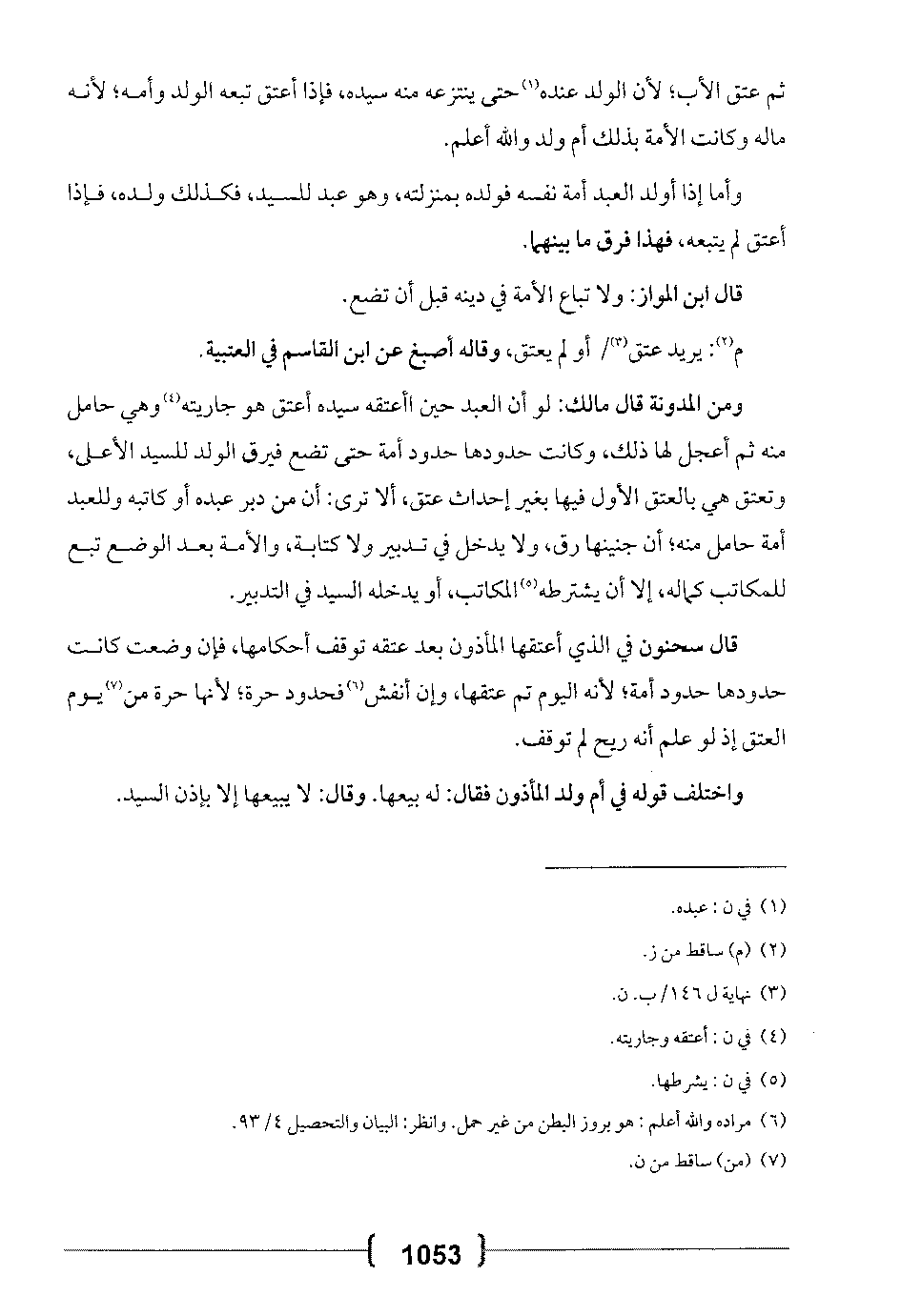 قال سحنون في الذي أعتقها المأذون بعد عتقه توقف أحكامها، فإن وضعت كانت حدودها حدود أمة؛ لأنه اليوم تم عتقها، وإن أنفش فحدود حرة؛ لأنها حرة من يوم العتق إذ لو علم أنه ريح لم توقف.