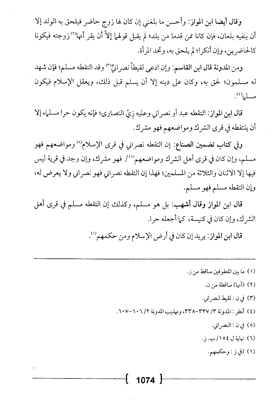 وفي كتاب تضمين الصناع: إن التقطه نصراني ي قرى الإسلام ومواضعهم فهو مسلم، وإن كان في قرى أهل الشرك ومواضعهم فهو مشرك، وإن وجد في قرية ليس فيها إلا الاثنان والثلاثة من المسلمين؛ فهذا إن التقطه نصراني فهو نصراني ولا يعرض له، وإن التقطه مسلم فهو مسلم.