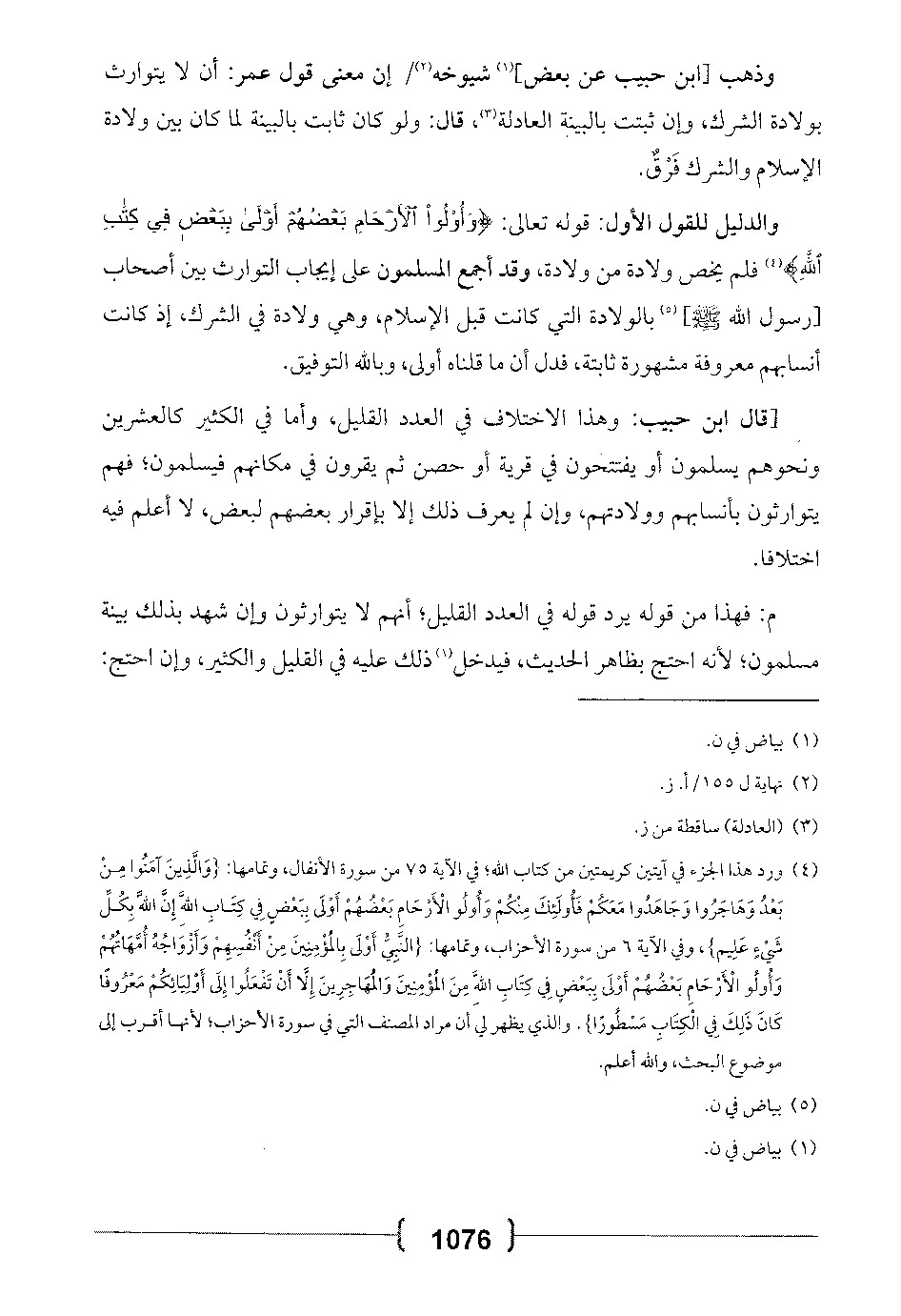 [قال ابن حبيب: وهذا الاختلاف في العدد القليل، وأما في الكثير كالعشرين ونحوهم يسلمون أو يفتتحون في قرية أو حصن ثم يقرون في مكانهم فيسلمون؛ فهم يتوارثون بأنسابهم وولادتهم، وإن لم يعرف ذلك إلا بإقرار بعضهم لبعض، لا أعلم فيه اختلافاً.