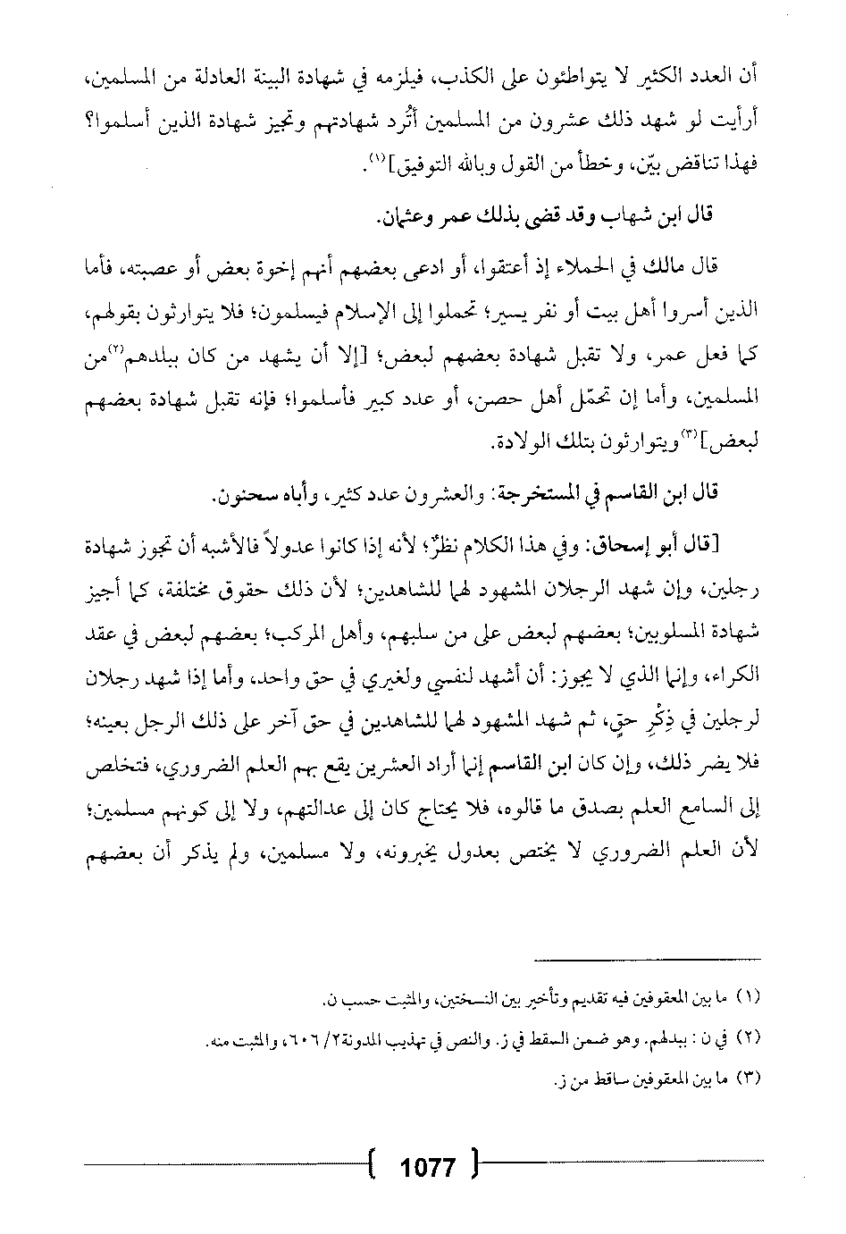 أن العدد الكثير لا يتواطئون على الكذب، فيلزمه في شهادة البينة العادلة من المسلمين، أرأيت لو شهد ذلك عشرون من المسلمين أترد شهادتهم وتجيز شهادة الذين أسلموا؟ فهذا تناقض بين، وخطأ من القول وبالله التوفيق].