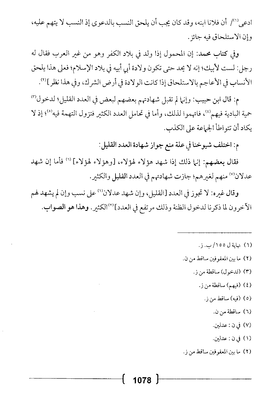 وقال غيره: لا تجوز في العدد [القليل، وإن شهد عدلان على نسب وإن لم يشهد لهم الآخرون لما ذكرنا لدخول الظنة وذلك مرتفع في العدد] الكثير. وهذا هو الصواب.