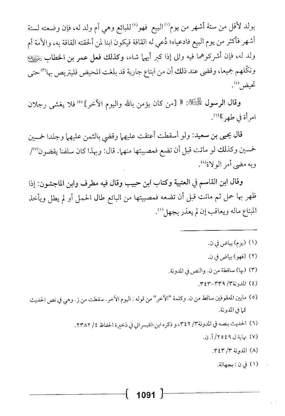 بولد لأقل من ستة أشهر من يوم البيع فهو للبائع وهي أم ولد له، فإن وضعته لستة أشهر فأكثر من يوم البيع فادعياه؛ دُعي له القافة فيكون ابناً لمن ألحقته القافة به، وأمة أم ولد له، فإن أشركوها فيه والى إذا كبر أيهما شاء، وكذلك فعل عمر بن الخطاب -رضي الله عنه- ونكلهم جميعاً، وقضى عند ذلك أن من ابتاع جارية قد بلغت المحيط فليتربص بها حتى تحيض.