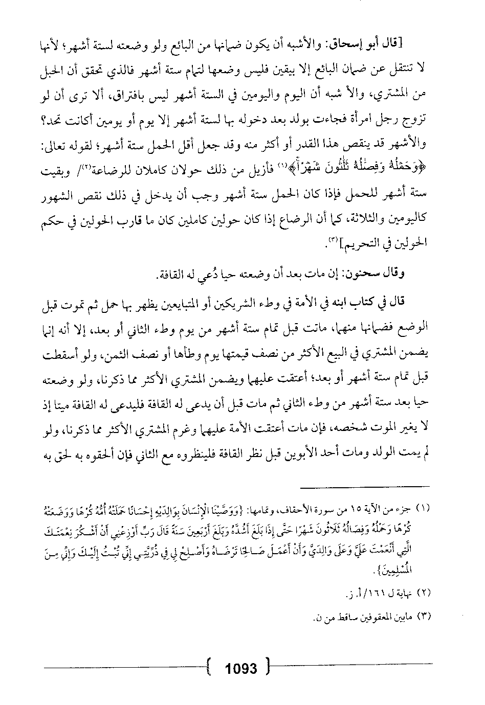 [قال أبو إسحاق: والأشبه أن يكون ضمانها من البائع ولو وضعته لستة أشهر؛ لأنها لا تنتقل عن ضمان البائع إلا بيقين فليس وضعها لتمام ستة أشهر فالذي تحقق أن الحبل من المشتري، والأشبه أن اليوم واليومين في الستة أشهر ليس افتراق، ألا ترى أن لو تزوج رجل امرأة فجاءت بولد بعد دخوله بها لستة أشهر إلا يوم أو يومين أكانت تحد؟ والأشهر قد ينقص هذا القدر أو أكثر منه وقد جعل أقل الحمل ستة أشهر؛ لقوله تعالى: {وَحَمْلُهُ وَفِصَالُهُ ثَلاثُونَ شَهْرًا} فأزيل من ذلك حولان كاملان للرضاة وبقيت ستة أشهر للحمل فإذا كان الحمل ستة أشهر وجب أن يدخل في ذلك نقص الشهور كاليومين والثلاثة، كما أن الرضاع إذا كان حولين كاملين كان ما قارب الحولين في حكم الحولين في التحريم].