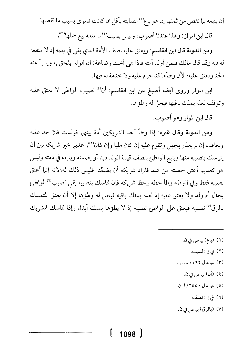 ابن المواز وروى أيضاً أصبغ عن ابن القاسم: أن نصيب الوطء لا يعتق عليه وتوقف لعله يملك باقيها فيحل له وطؤها.