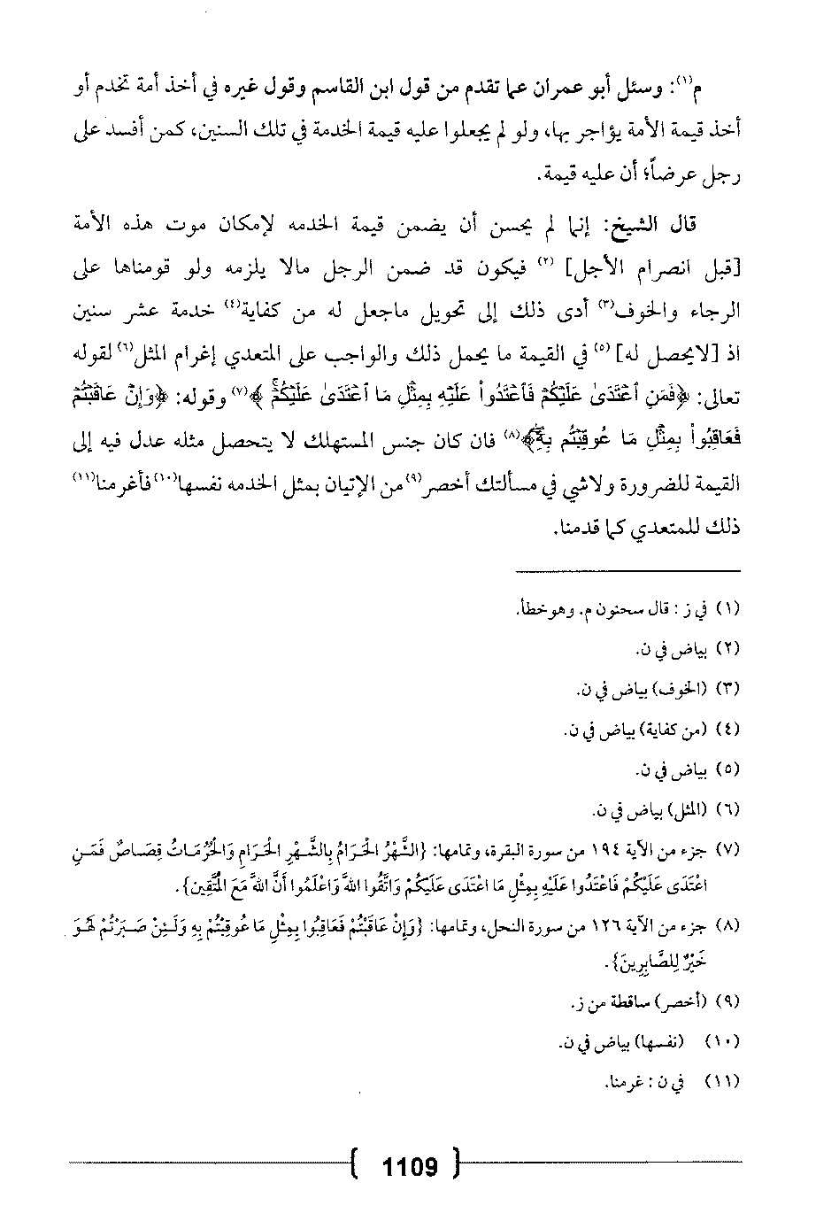 قال الشيخ: إنما لم يحسن أن يضمن قيمة الخدمة لإمكان موت هذه الأمة [قبل انصرام الأجل] فيكون قد ضمن الرجل مالا يلزمه ولو قومناها على الرجاء والخوف أدى ذلك إلى تحويل ما جعل له من كفاية خدمة عشر سنين إذ [لا يحصل له] في القيمة ما يحمل ذلك والواجب على المتعدي إغرام المثل لقوله تعالى: {فَمَنِ اعْتَدَى عَلَيْكُمْ فَاعْتَدُوا عَلَيْهِ بِمِثْلِ مَا اعْتَدَى عَلَيْكُمْ} وقوله: {وَإِنْ عَاقَبْتُمْ فَعَاقِبُوا بِمِثْلِ مَا عُوقِبْتُمْ بِهِ} فإن كان جنس المستهلك لا يتحصل مثله عدل فيه إلى القيمة للضرورة ولا شيء في مسألتك أخصر من الإتيان بمثل الخدمة نفسها فأغرمنا ذلك للمتعدي كما قدمنا.