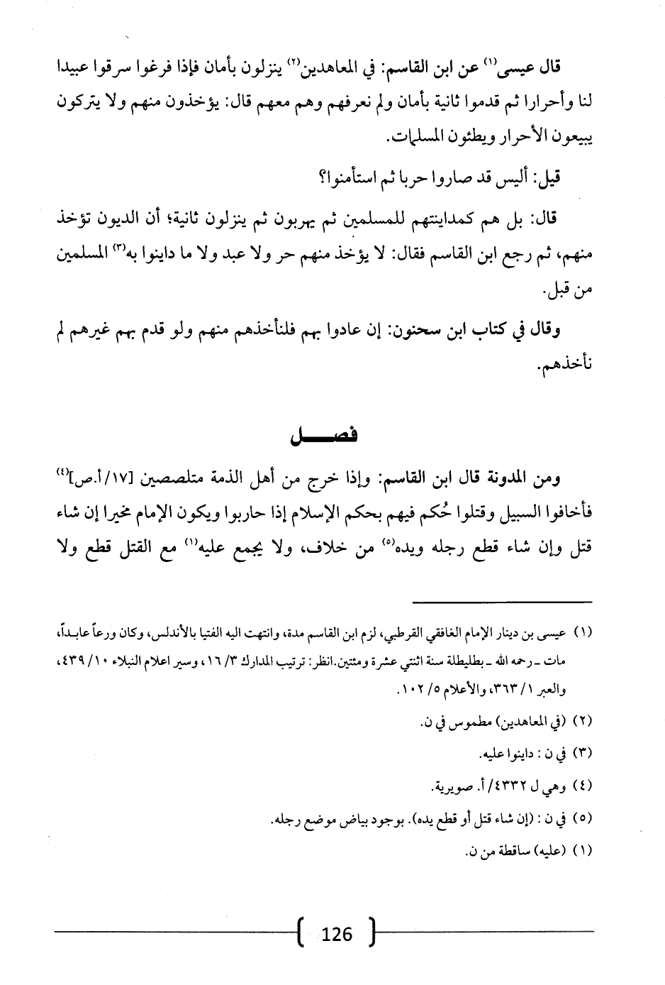 ومن المدونة قال ابن القاسم: وإذا خرج من أهل الذمة متلصصين فأخافوا السبيل وقتلوا حكم فيها بحكم الإسلام إذا حاربوا ويكون الإمام مخيراً إن شاء قتل وإن شاء قطع رجله ويده من خلاف، ولا يجمع عليه مع القتل قطع ولا