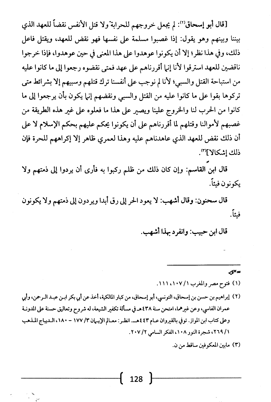 [قال أبو إسحاق: لم يجعل خروجهم للحرابة ولا قتل الأنفس نقضاً للعهد الذي بيننا وبينهم وهو يقول: إذا غصبوا مسلمة على نفسها فهو نقض للعهد، ويقتل فاعل ذلك، وفي هذا نظر؛ إلا أن يكونوا عوهدوا على هذا المعنى في حين عوهدوا، فإذا خرجوا ناقضين للعهد استرقوا لأنا إنما أقررناهم على عهد فمتى نقضوه رجعوا إلى ما كانوا عليه من استباحة القتل والسبي؛ لأنا لم نوجب على أنفسنا ترك قتلهم وسبيهم إلا بشرائط متى تركوها بقوا على ما كانوا عليه من القتل والسبي ونقضهم إنما يكون بأن يرجعوا إلى ما كانوا عليه من استباحة القتل والسبي؛ لأنا لم نوجب على أنفسنا ترك قتلهم وسبيهم إلا بشرائط متى تركوها بقوا على ما كانوا عليه من القتل والسبي ونقضهم إنما يكون بأن يرجعوا إلى ما كانوا من الحرب لنا والخروج علينا ويصير على هذا ما فعلوه على غير هذه الطريقة من غصبهم لأموالنا وقتلهم لما أقررناهم على أن يكونوا يحكم عليهم بحكم الإسلام لا على أن ذلك نقض للعهد الذي عاهدناهم عليه وهذا لعمري ظاهر إلا إكراههم للحرة فإن ذلك غشكالاً].