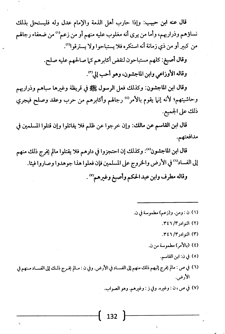 قال عنه ابن حبيب: وإذا حارب أهل الذمة والإمام عدل وله فليستحل بذلك نساؤهم وذراريهم، وأما من يرى أنه مغلوب عليه منهم أو من زعم من ضعفاء رجالهم من كبير أو من ذي زمانة أنه استكره فلا يستباحوا ولا يسترقوا.